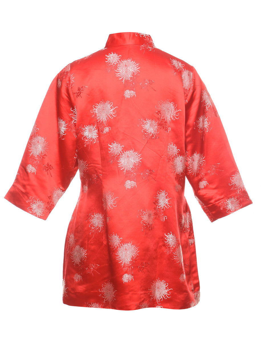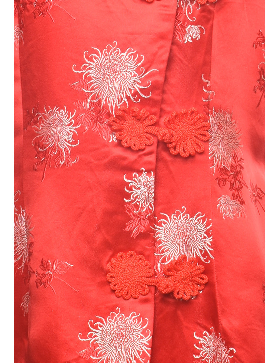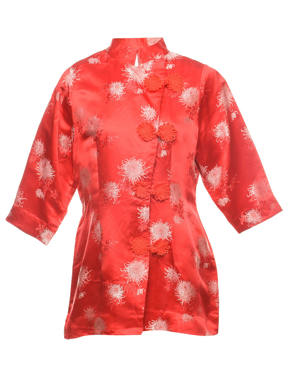 Brocade top in red with cheongsam collar.