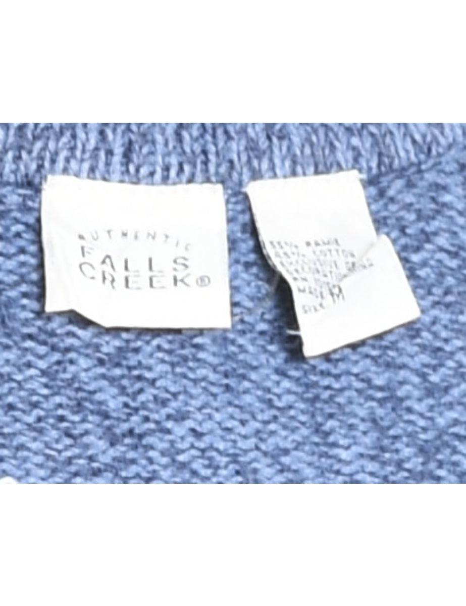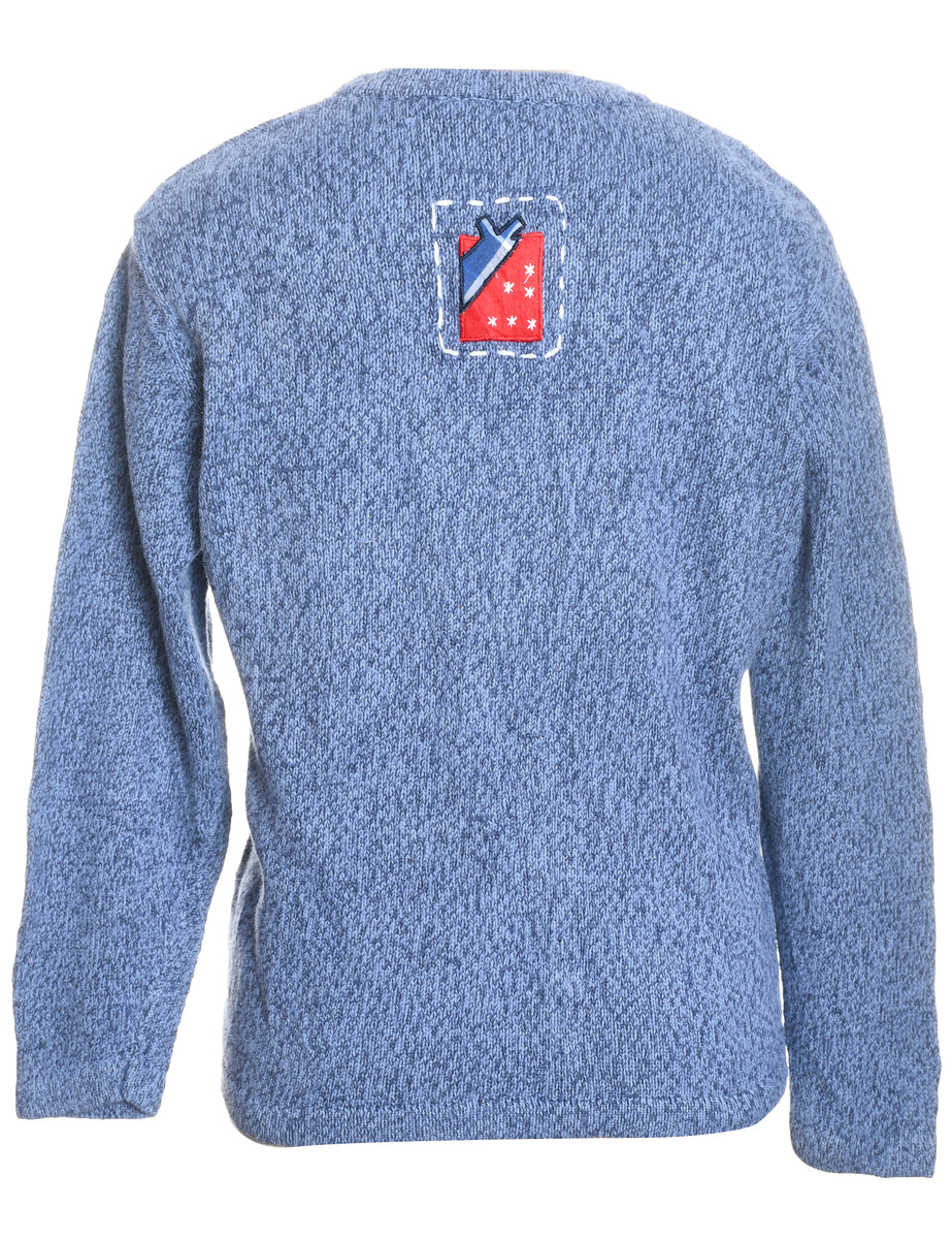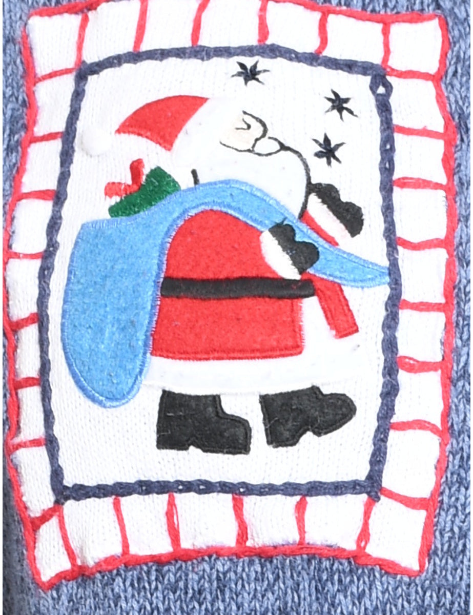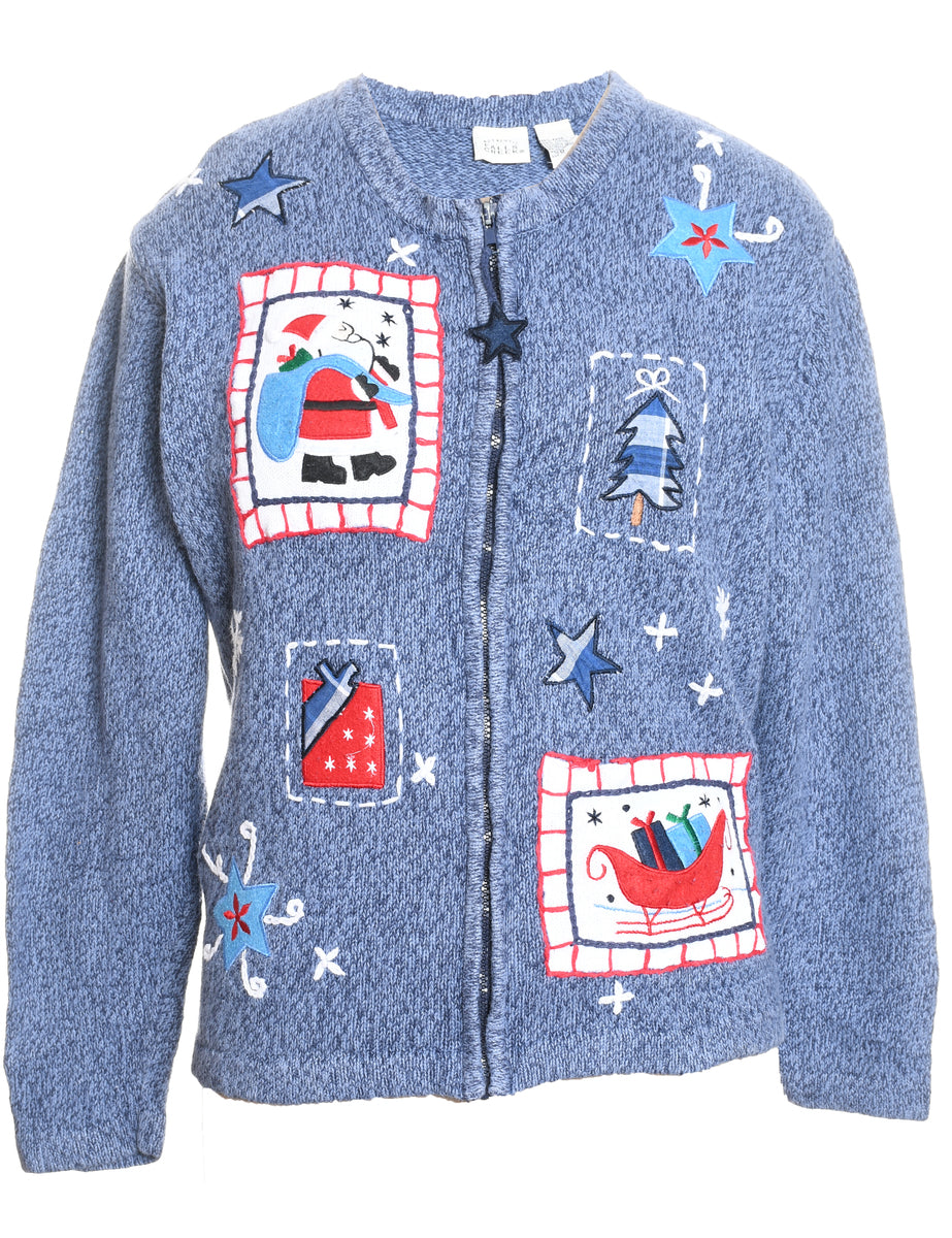 Santa claus christmas cardigan in blue with an applique design and a drop shoulder.