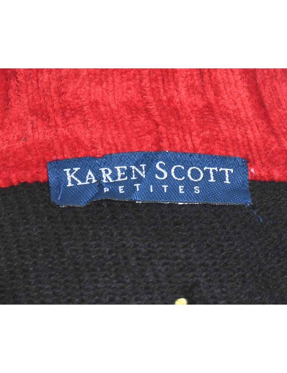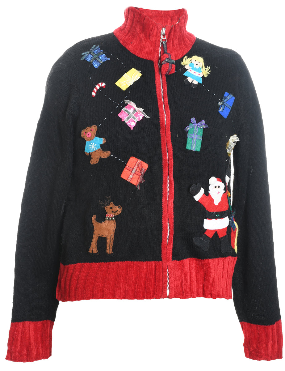 Santa claus reindeer christmas cardigan in black with a contrasting trim and an applique design.