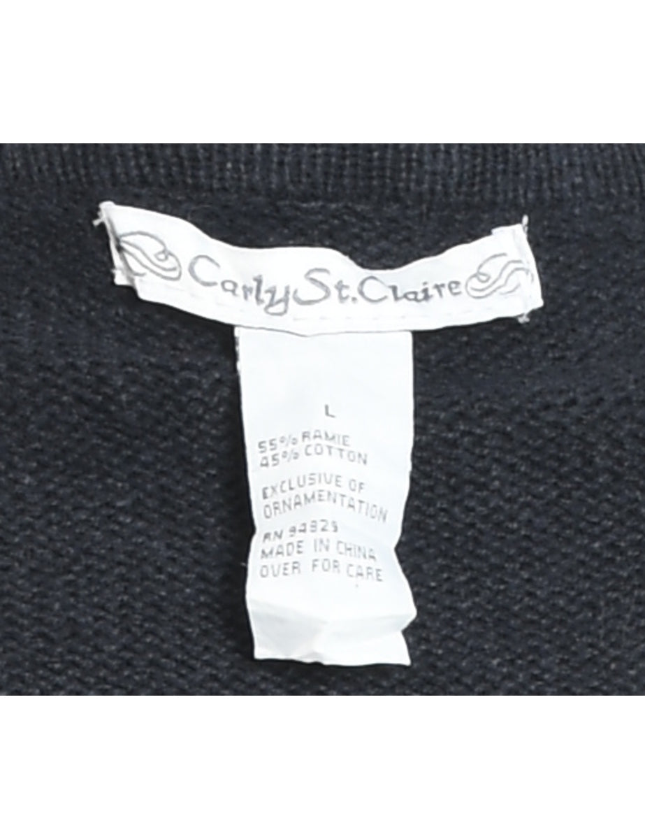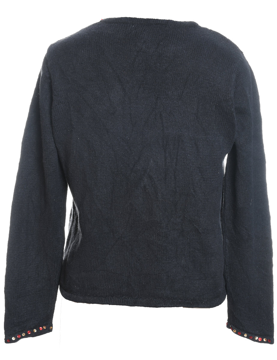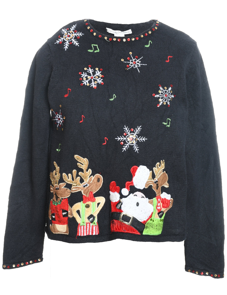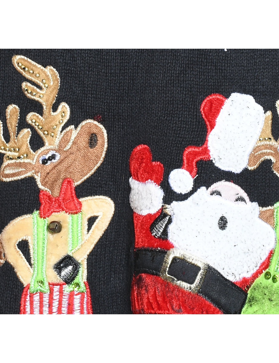 Santa claus reindeer black christmas jumper with lurex thread pattern and beading.