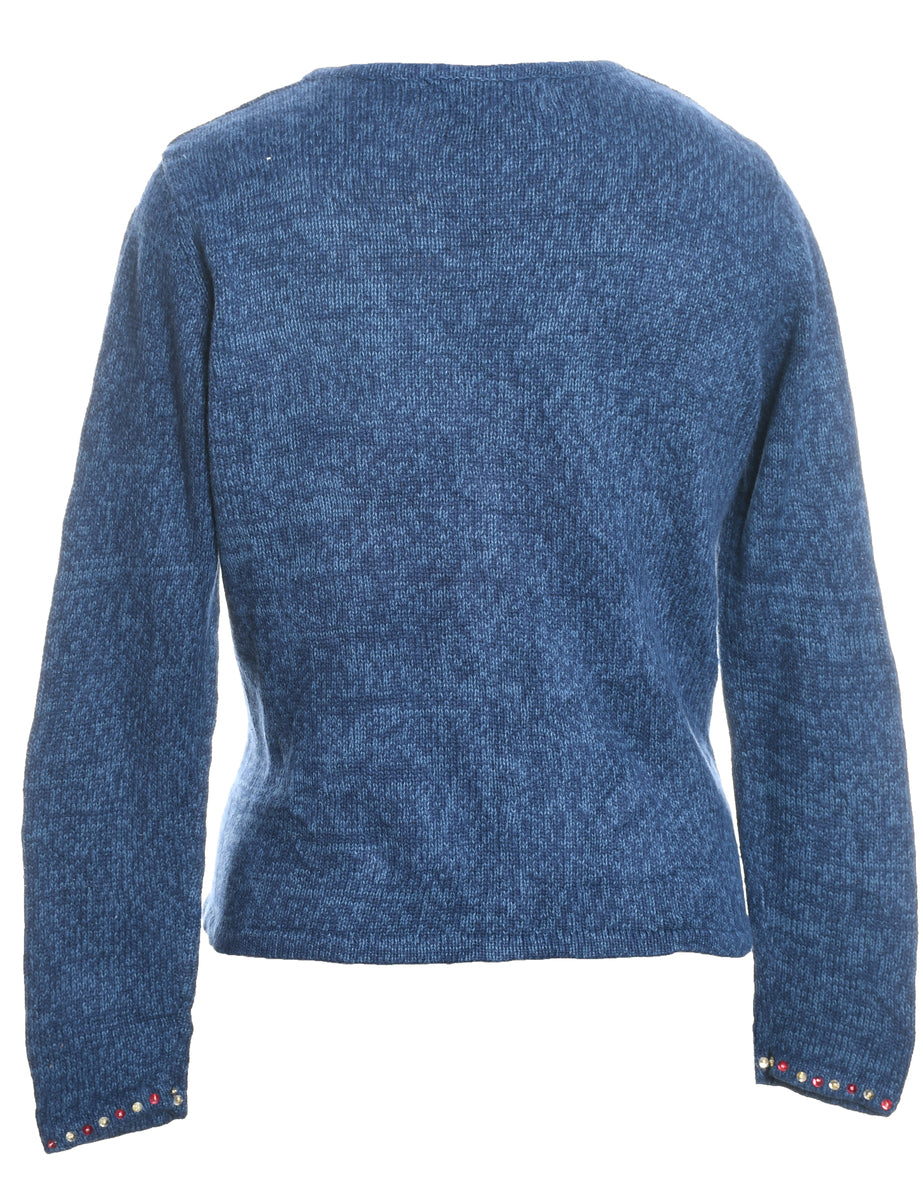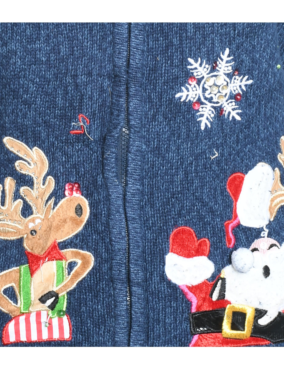 Santa Claus & Reindeer Navy Embroidered Zip-Front Christmas Cardigan - M