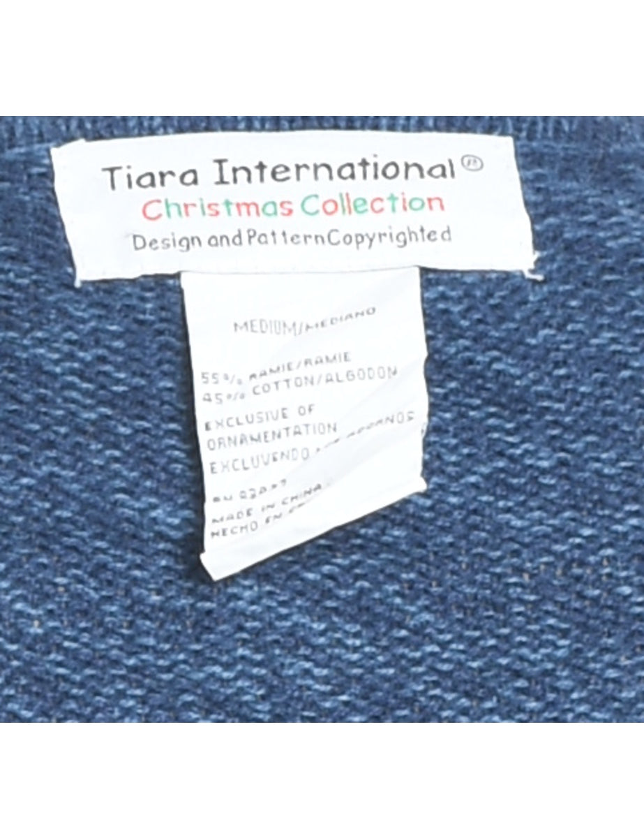 Santa Claus & reindeer design embroidered navy zip-front Christmas cardigan.