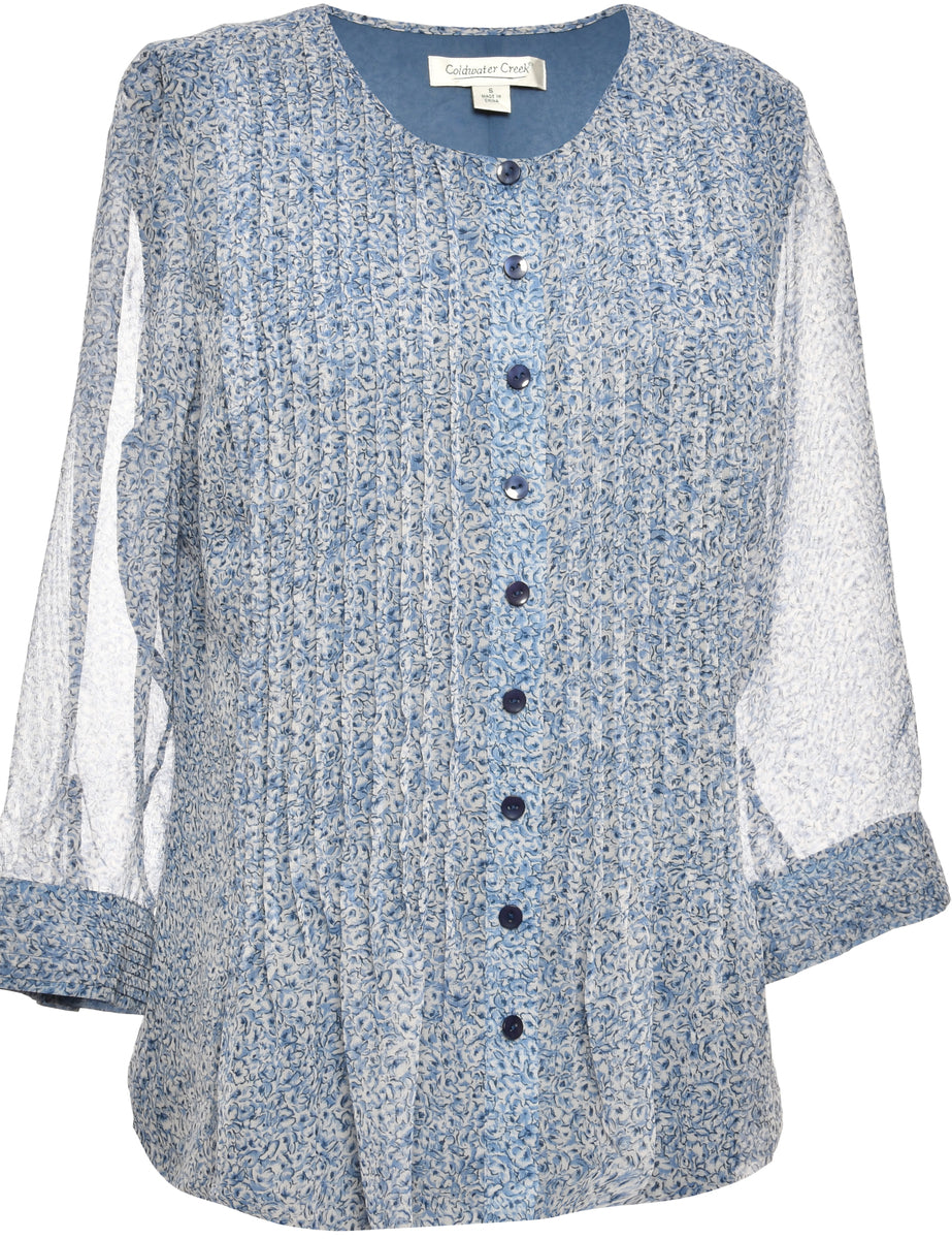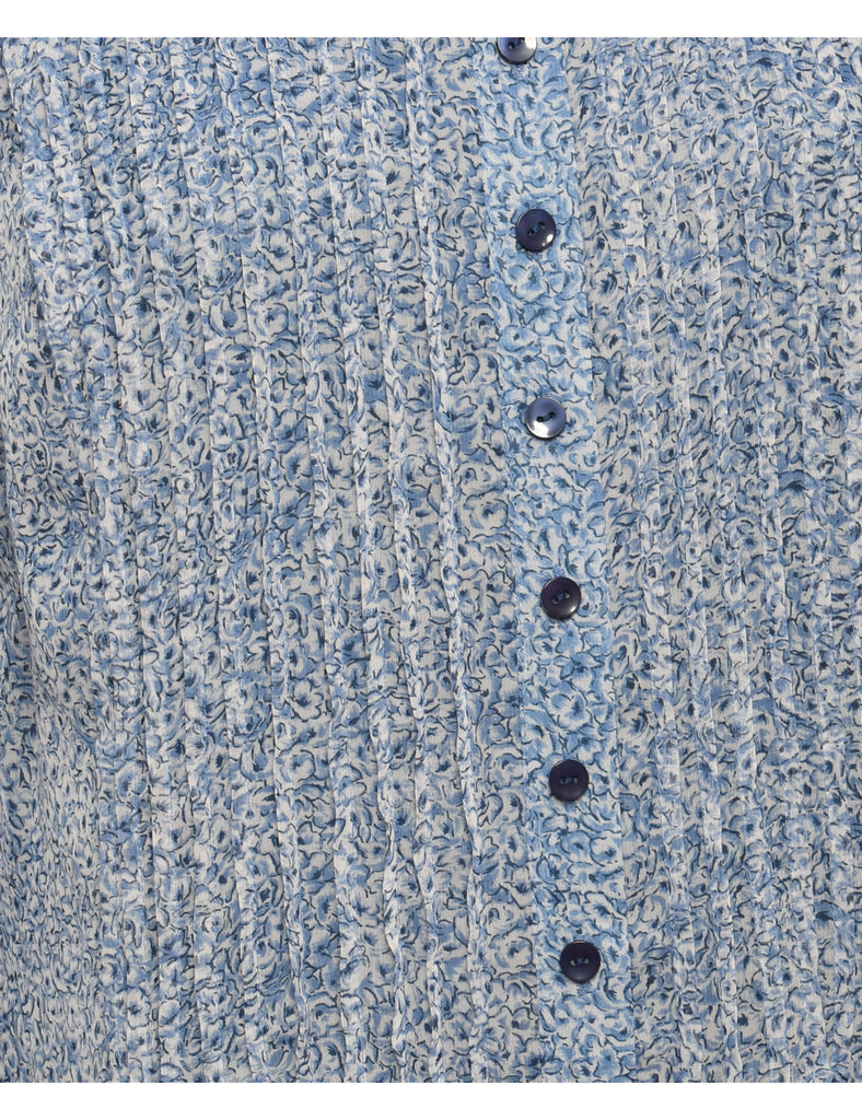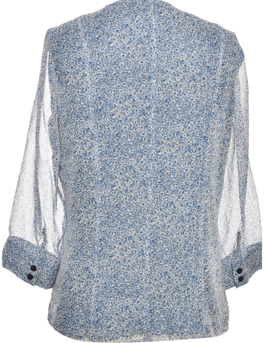 Button-front blue floral printed shirt complete with full lining, sheer sleeves and pleating.