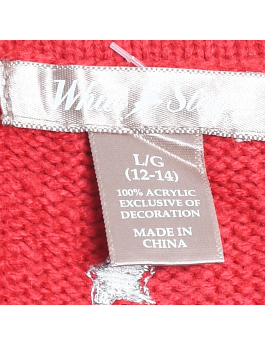 Snowman design red knit vest complete with an applique design and beading.