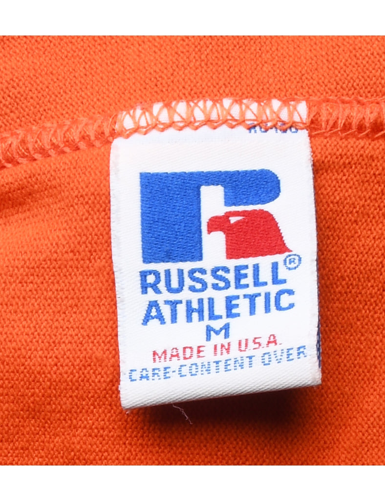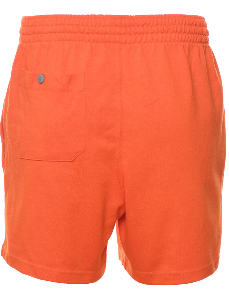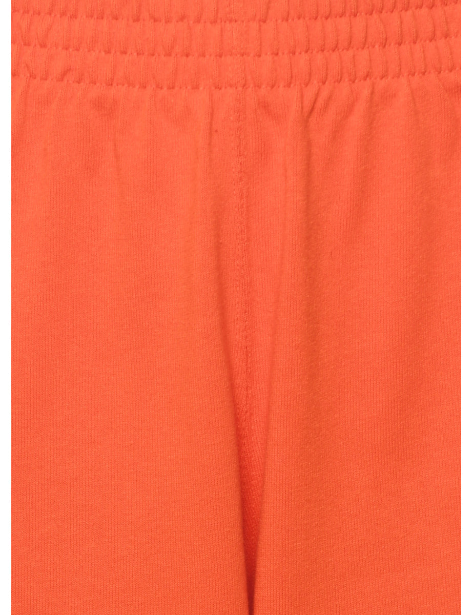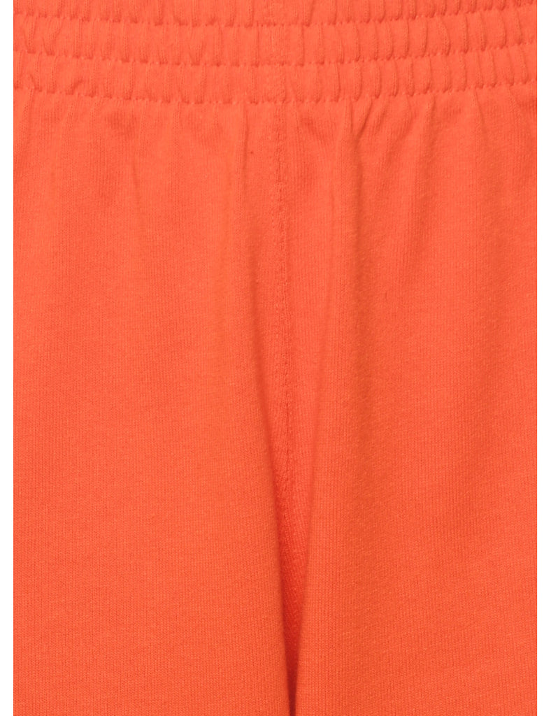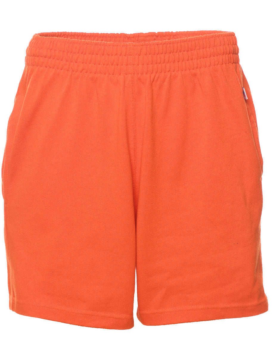 Sports shorts in orange with an elasticized back and multiple pockets.