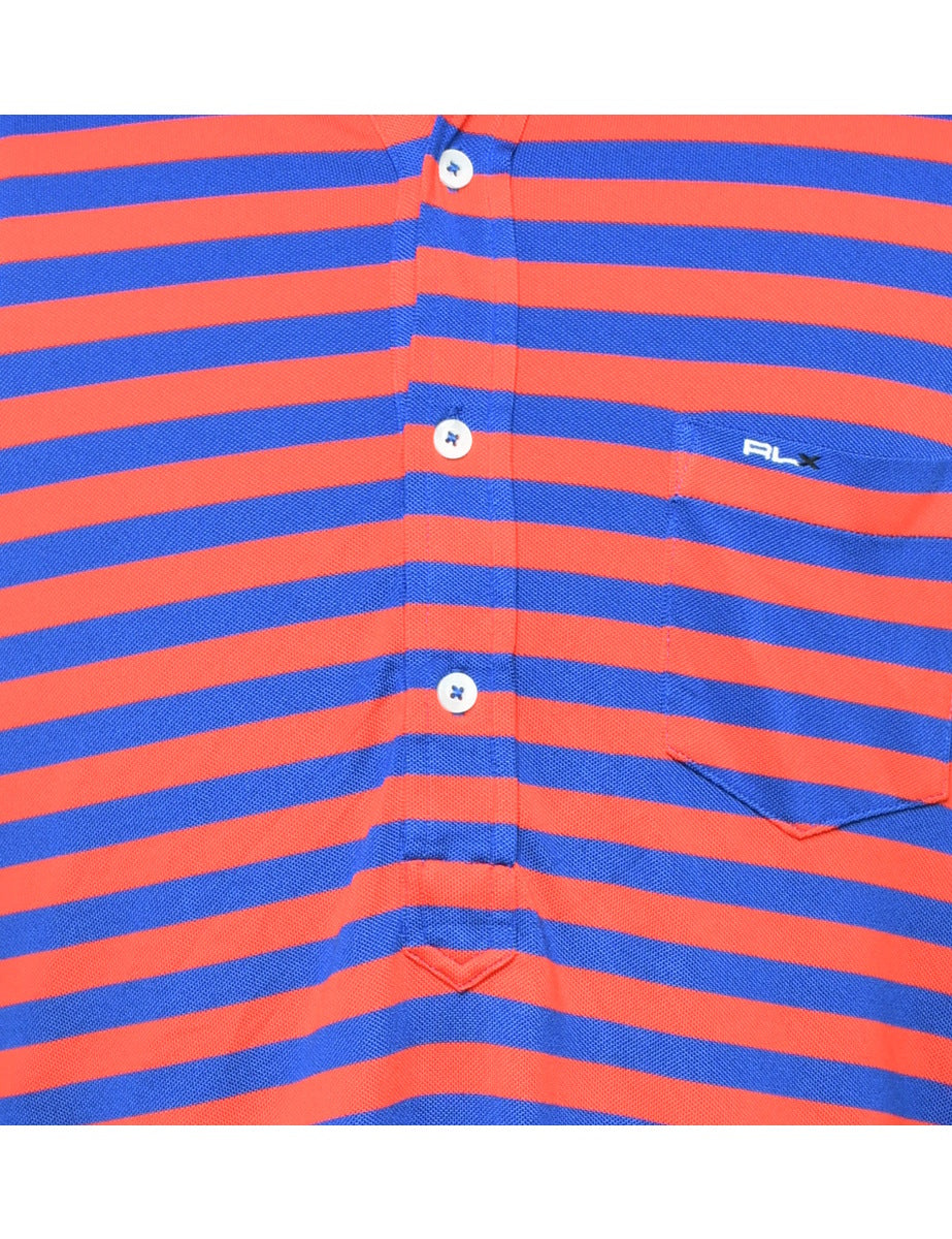Blue & red striped polo shirt with one pocket.