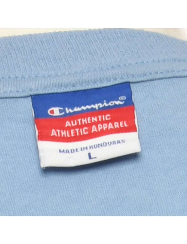Champion printed t-shirt comes in light blue.