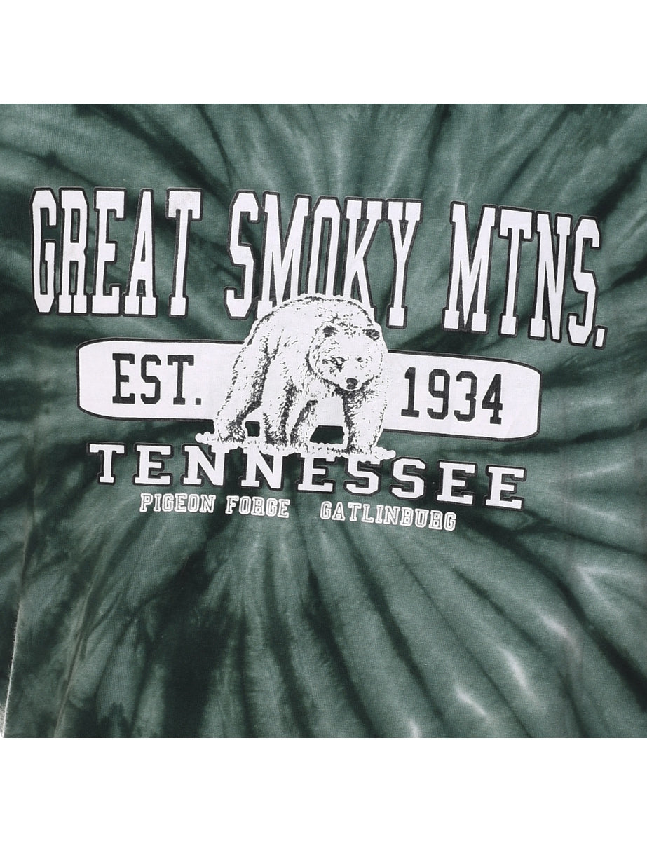 Tie dye Great Smoky MTNS printed t-shirt. Comes in dark green.