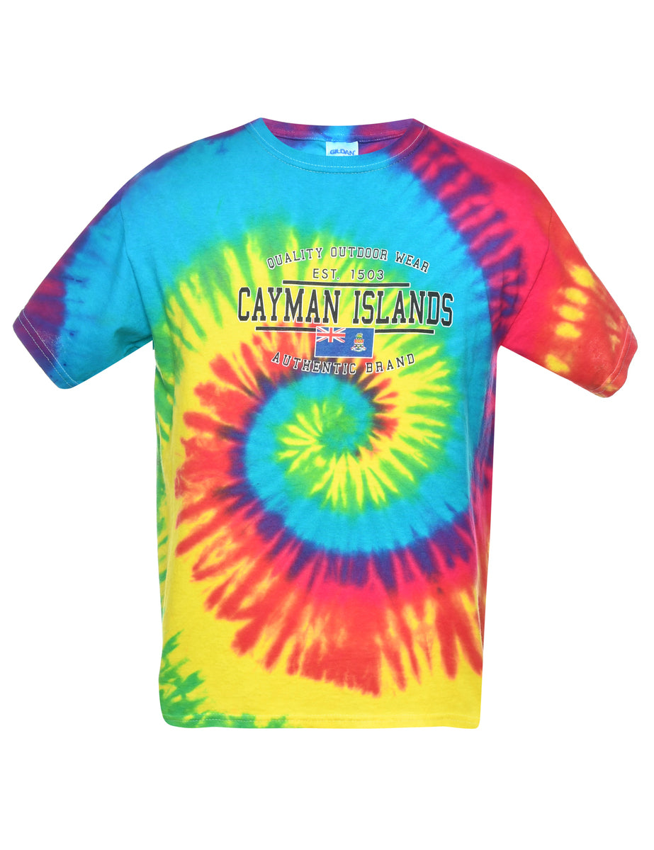 Tie dyed t-shirt in multi-colour. The size label mentions XL but based on the actual measurements we consider it a size M.