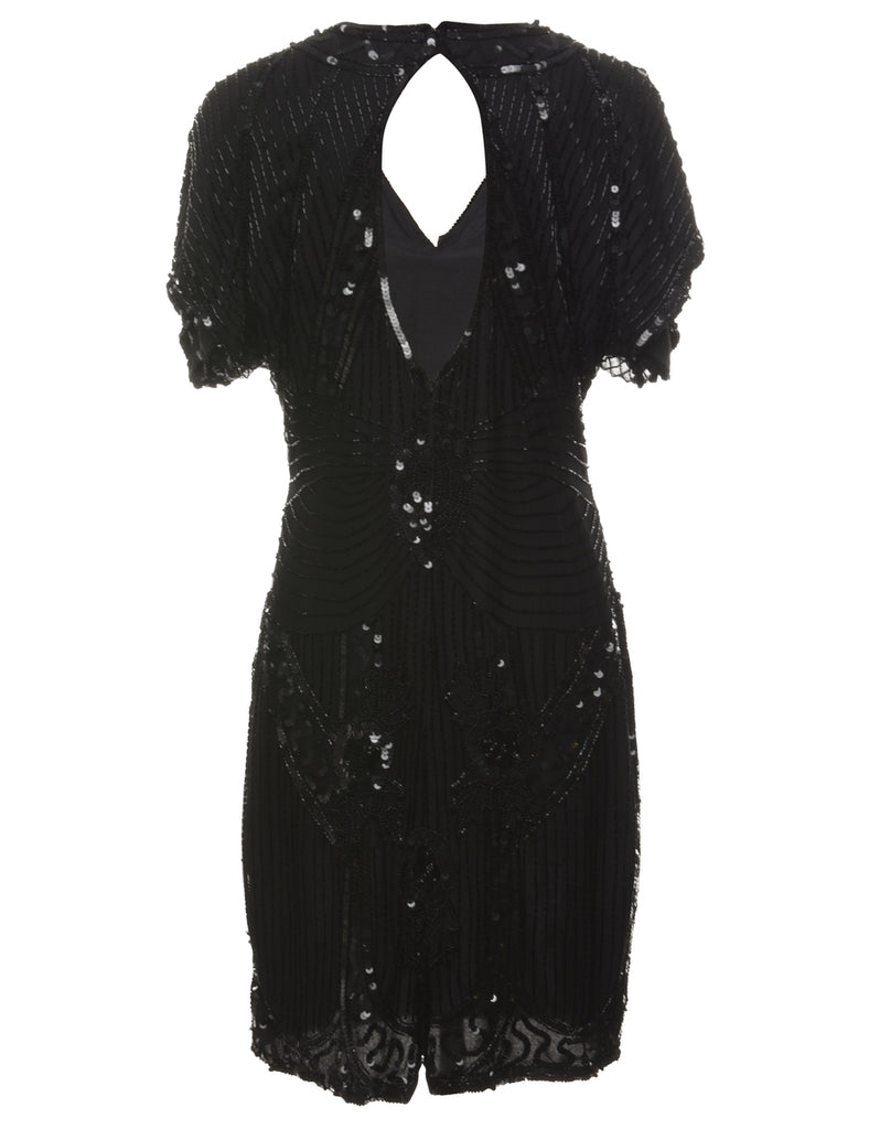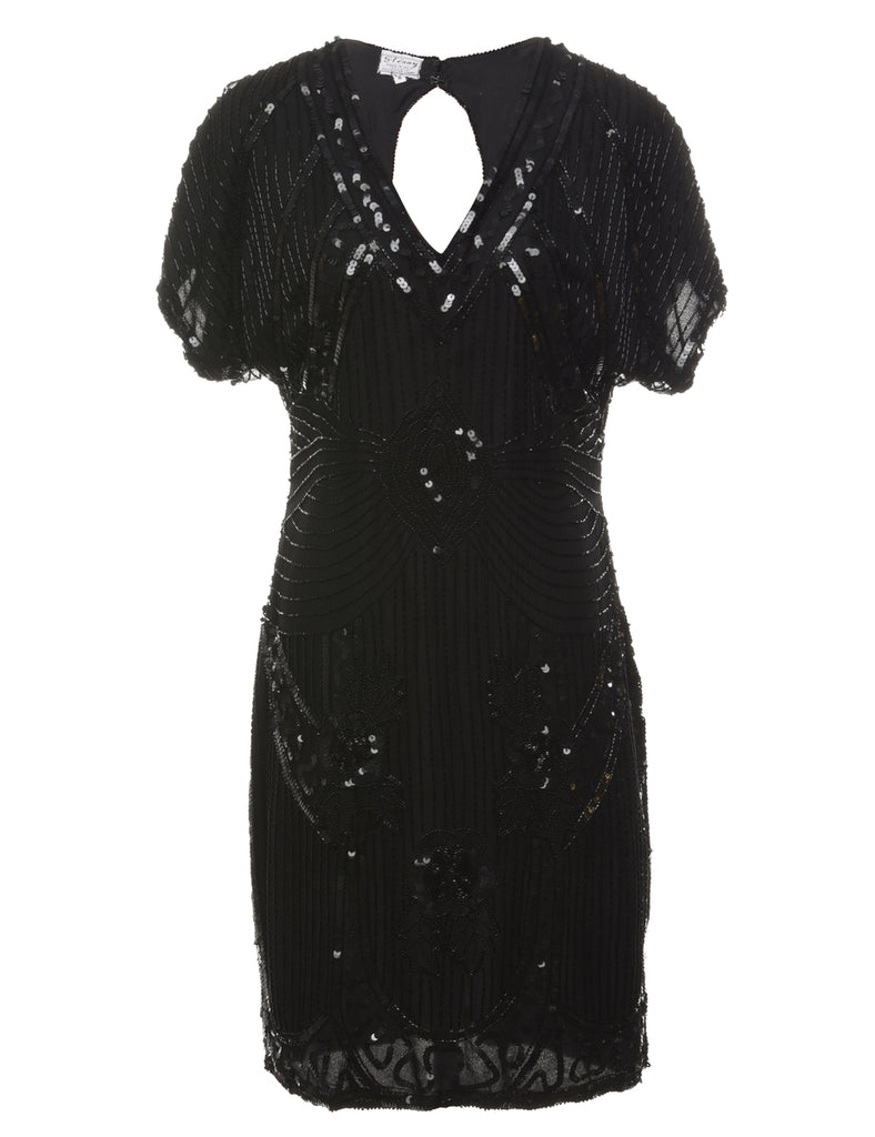 100% silk party dress with beaded and sequin comes in black with full lining.