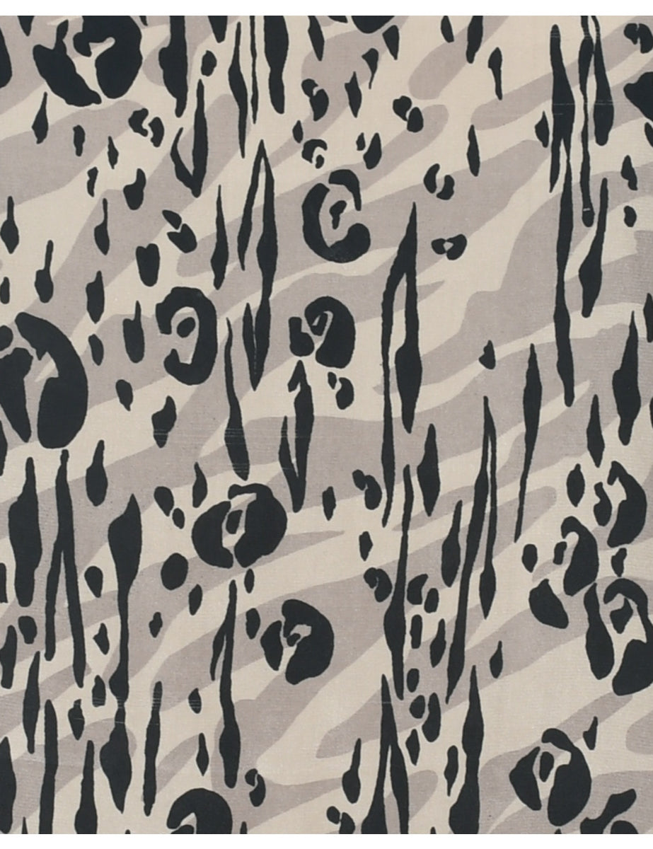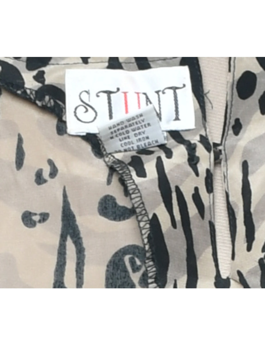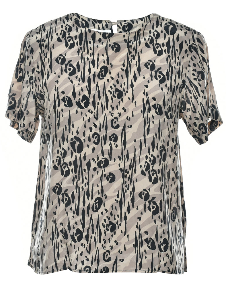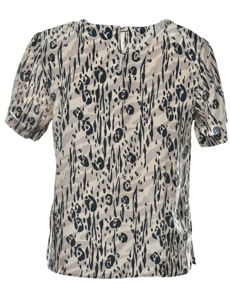 Animal printed top in brown with a round neck and removable shoulder pads.