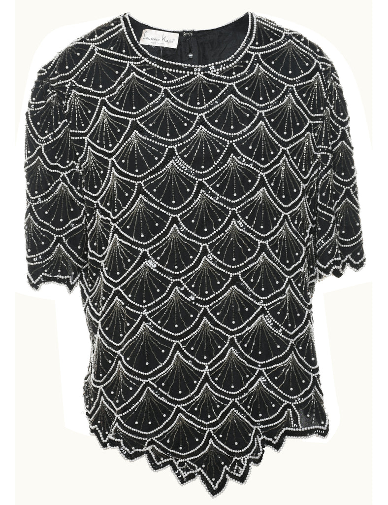 Sequined party top with beading. Comes in black with a scalloped hem and full lining.