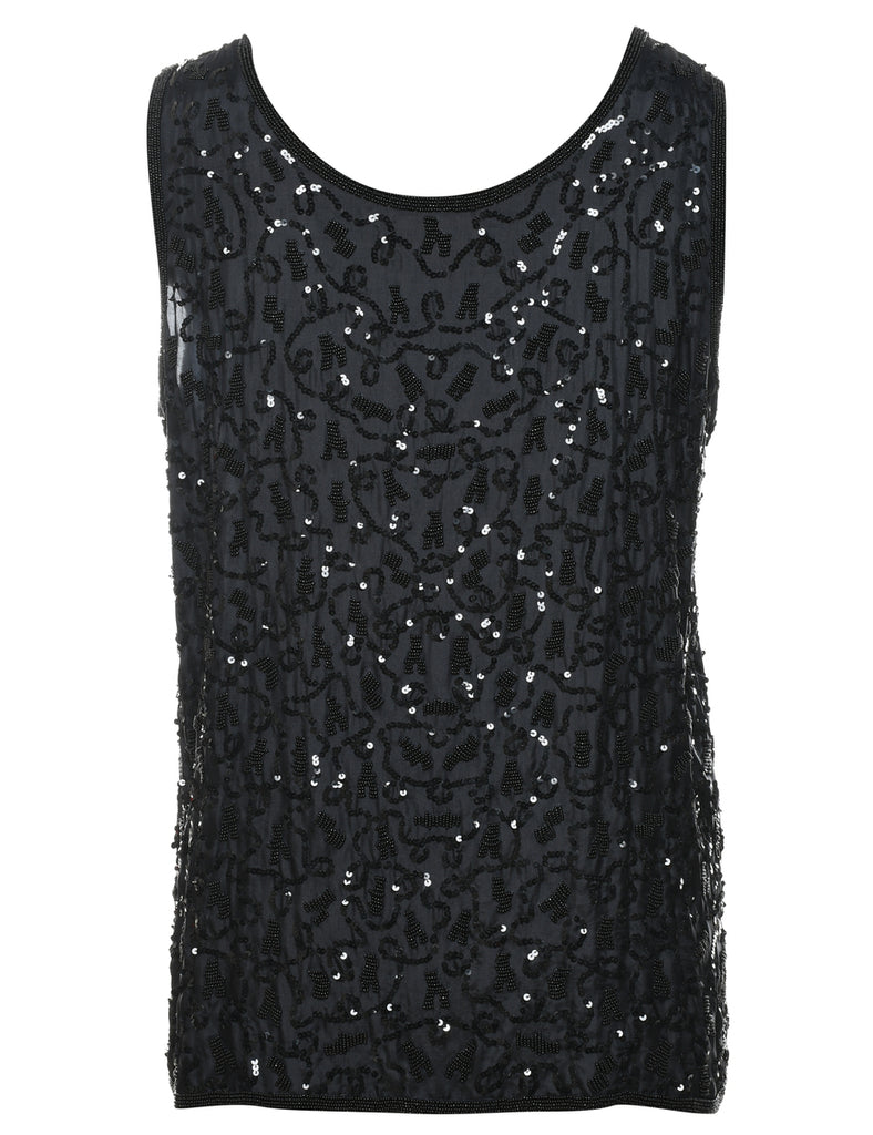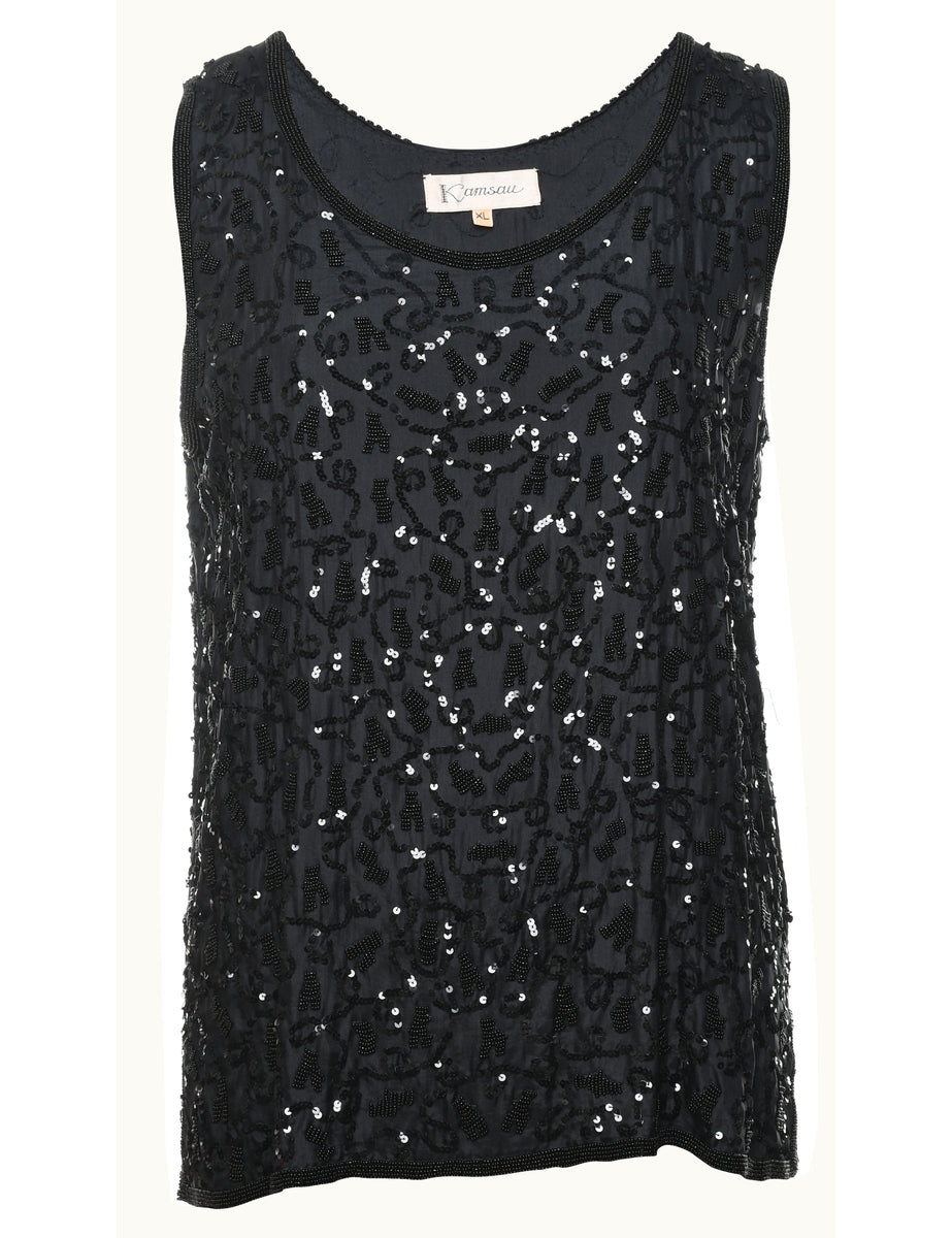 Sequined party top with beading. Comes in black. The size label mentions XL but based on the actual measurements we consider it a size L.
