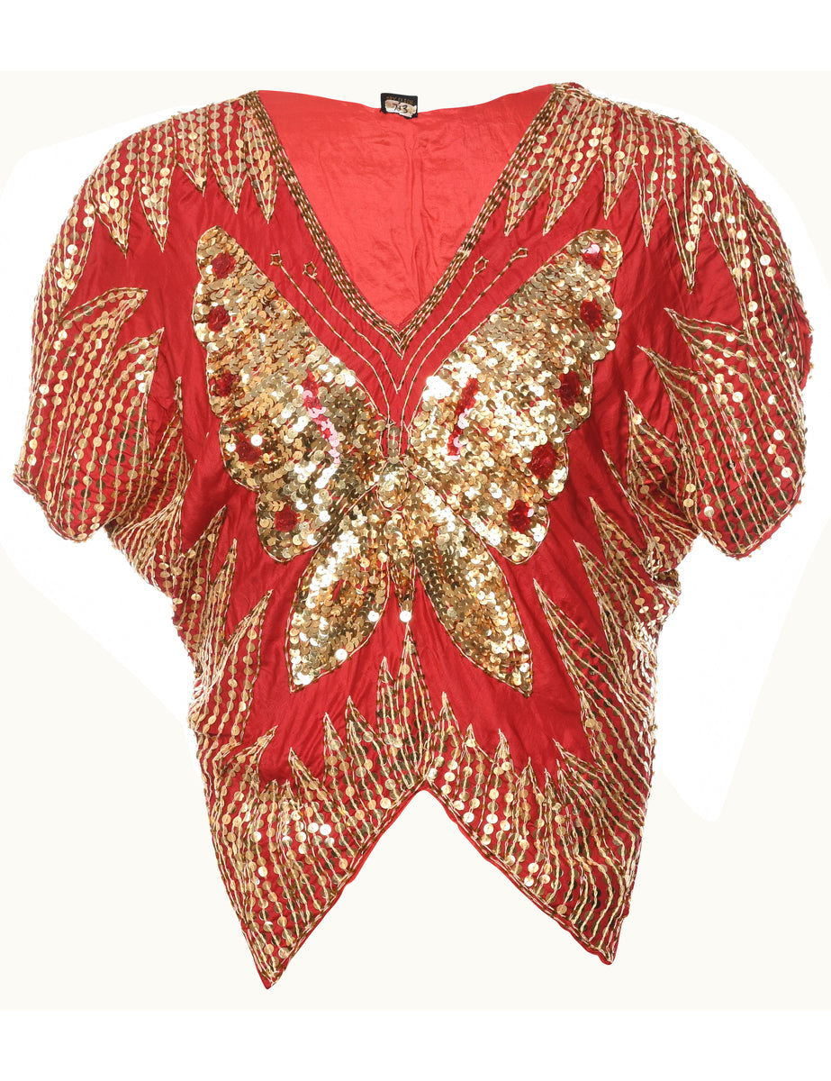 Sequined silk party top. Comes in red with full lining.