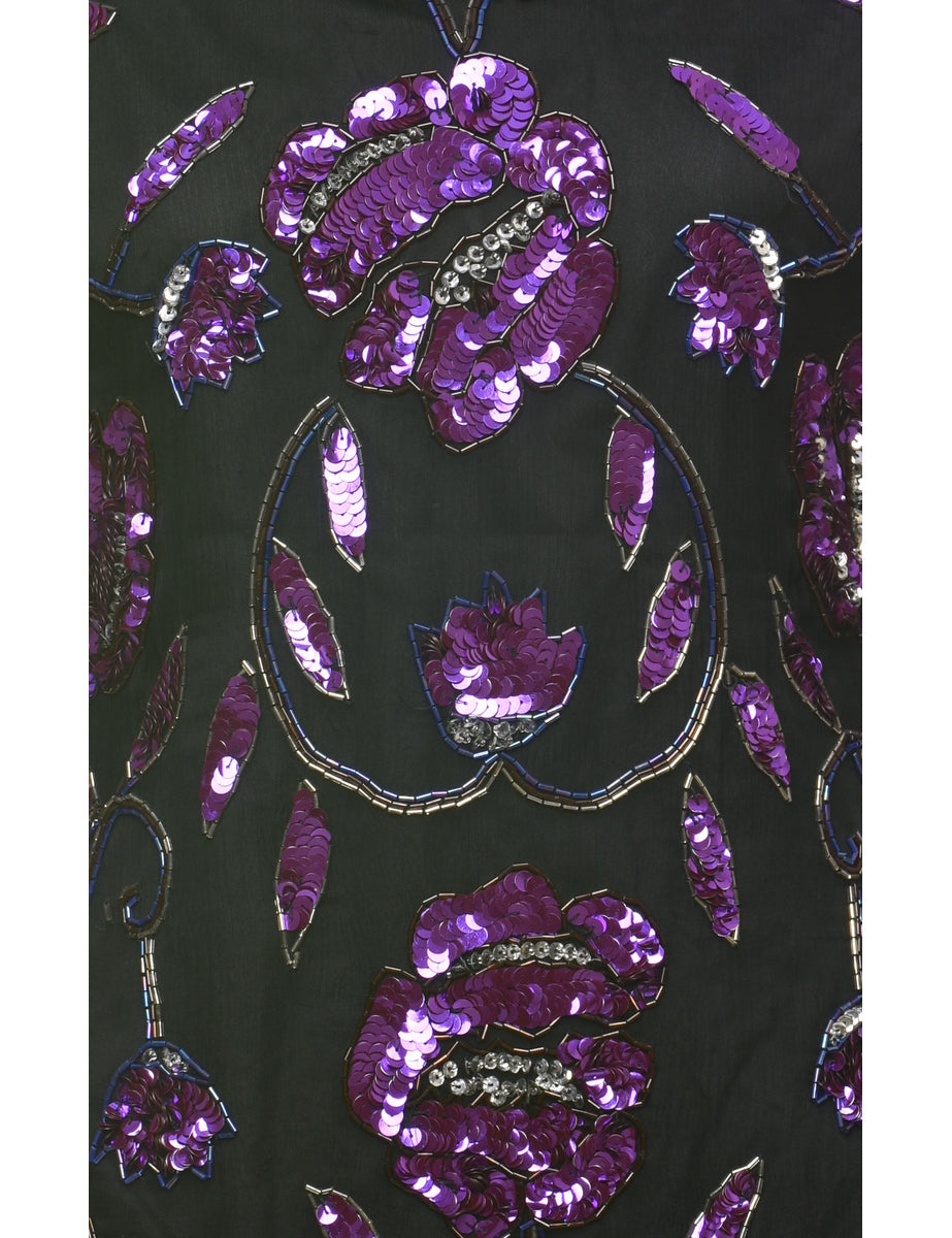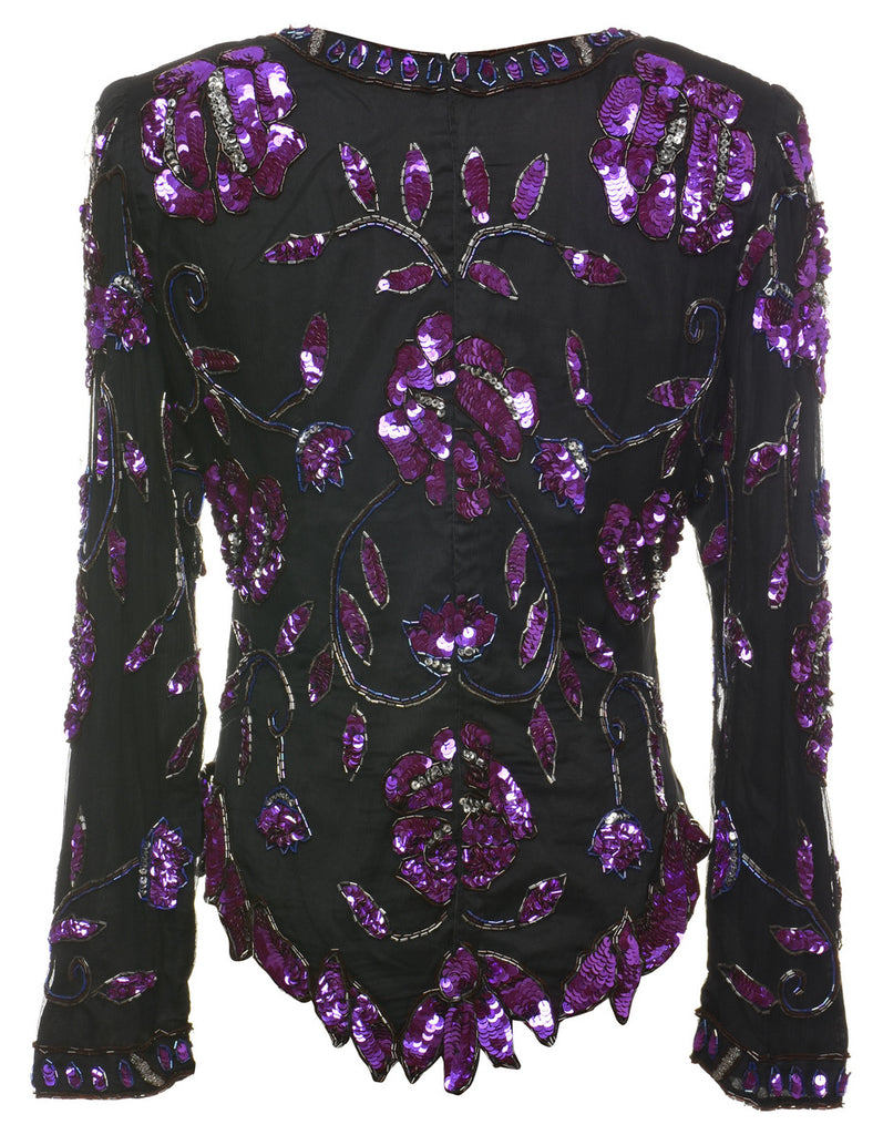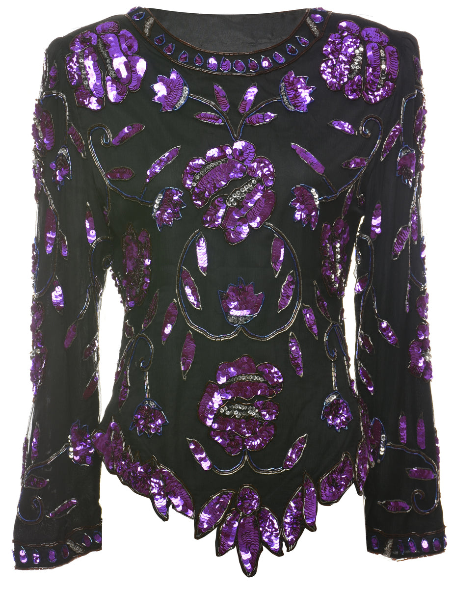 Sequined silk party top. Comes in black & purple with full lining and removable shoulder pads.
