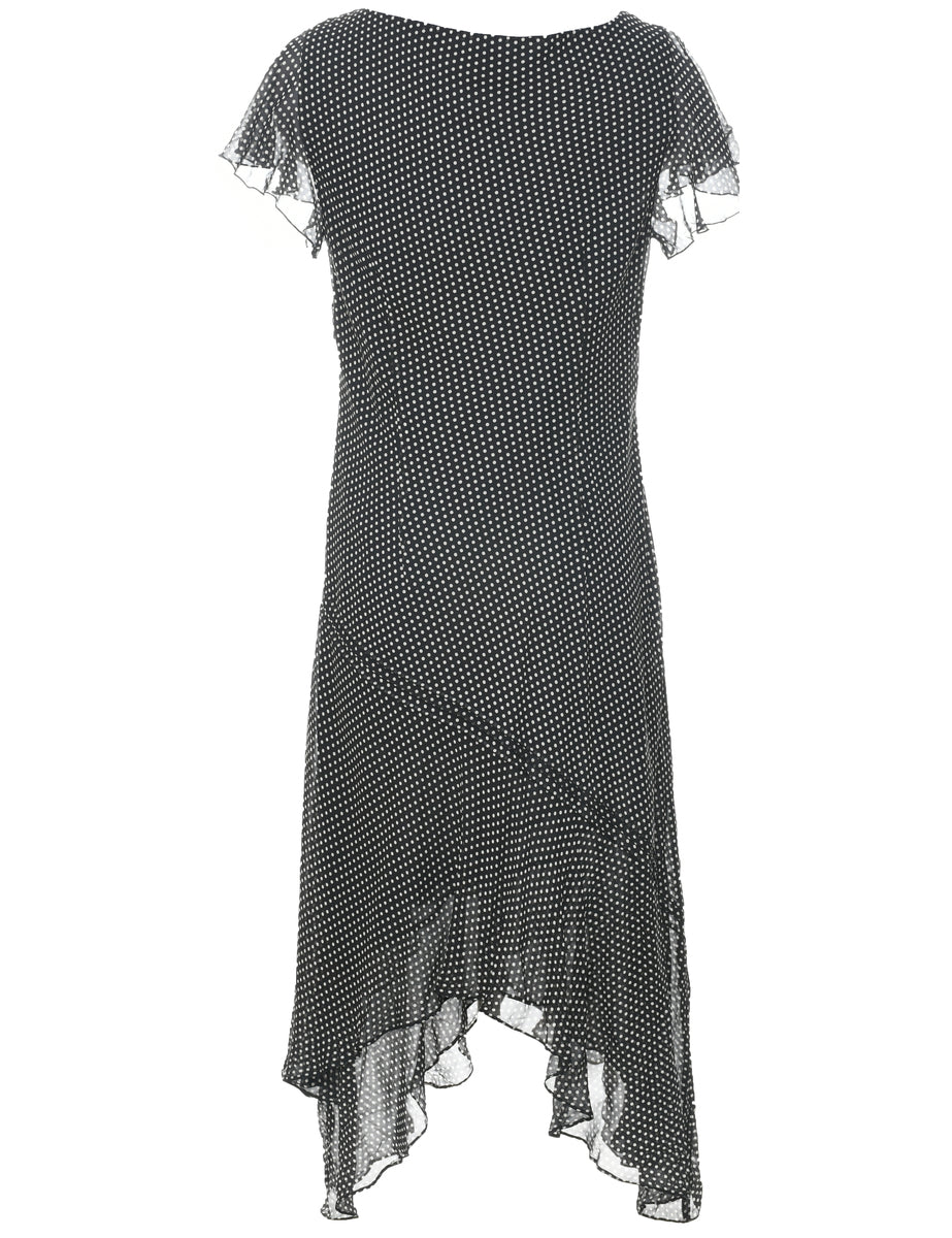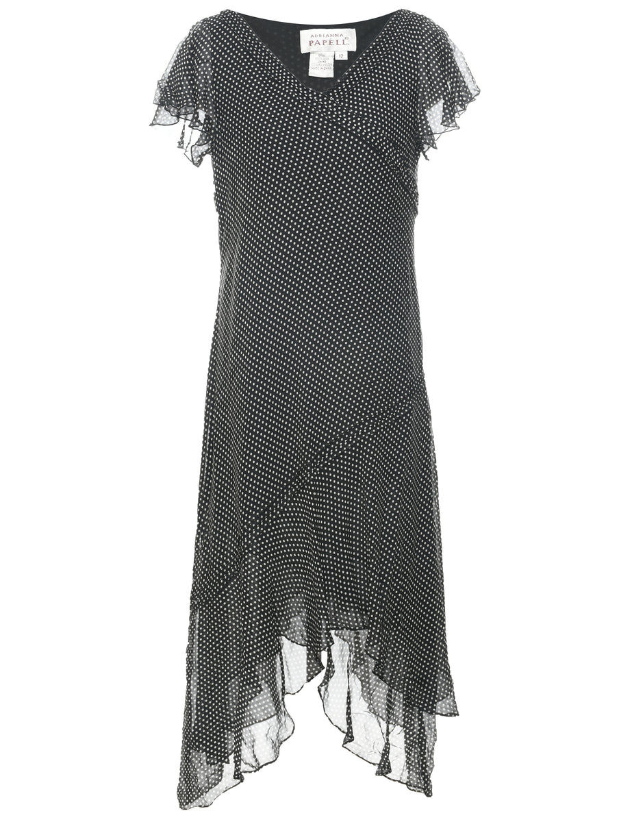 Adrianna Papell polka dot dress. Comes in black with an asymmetric hem and v neck.