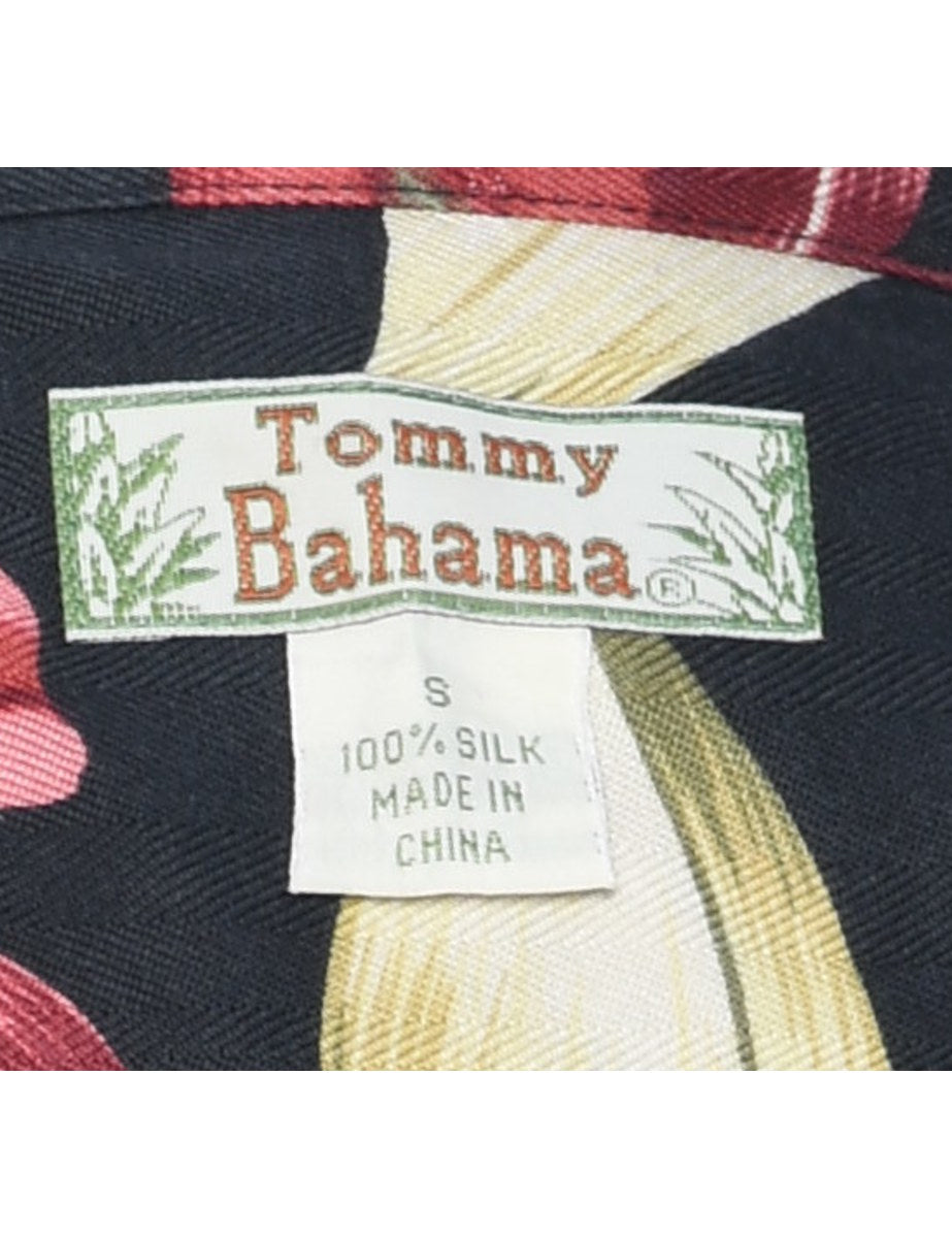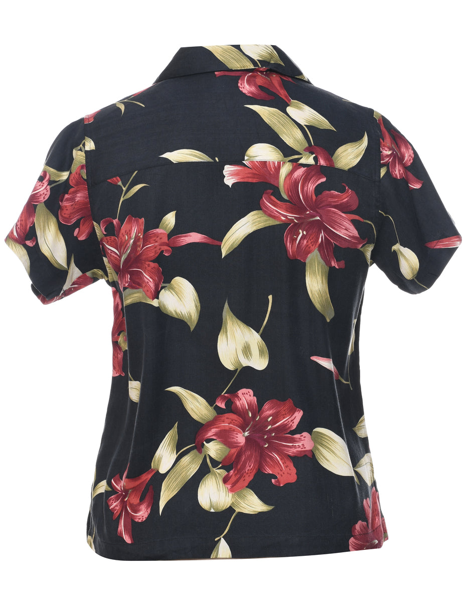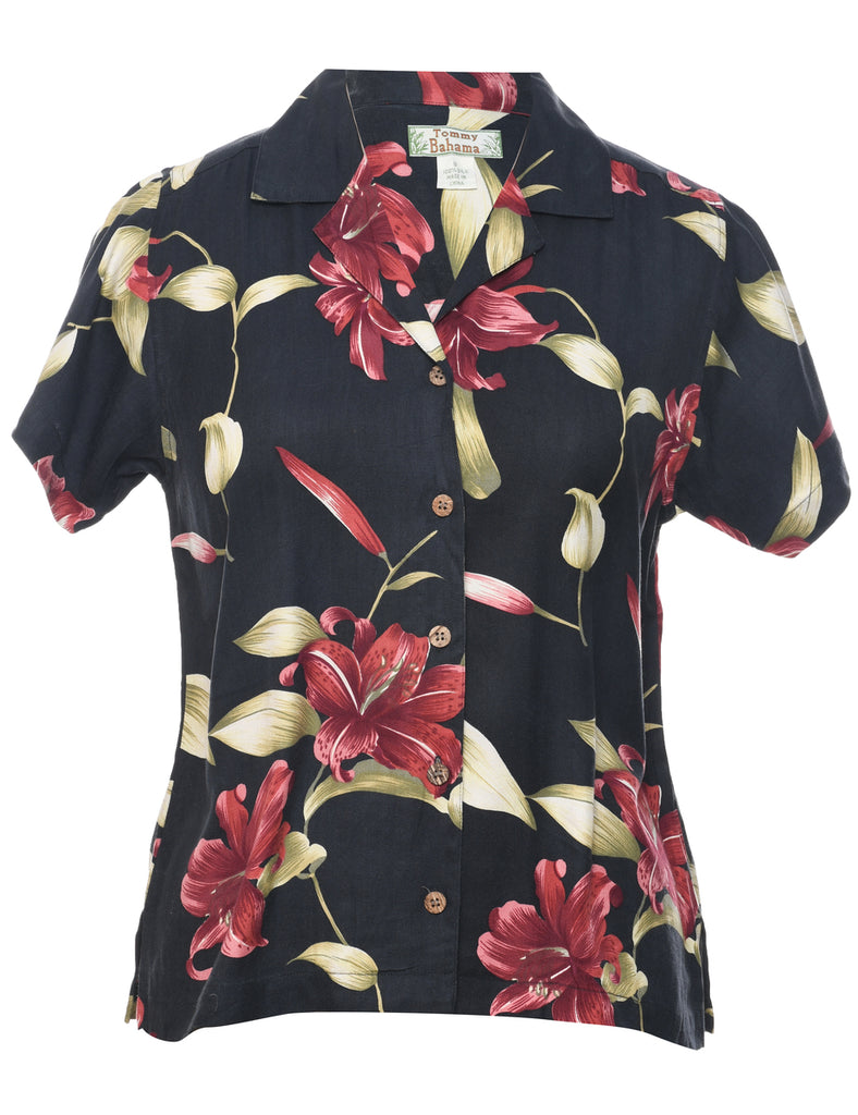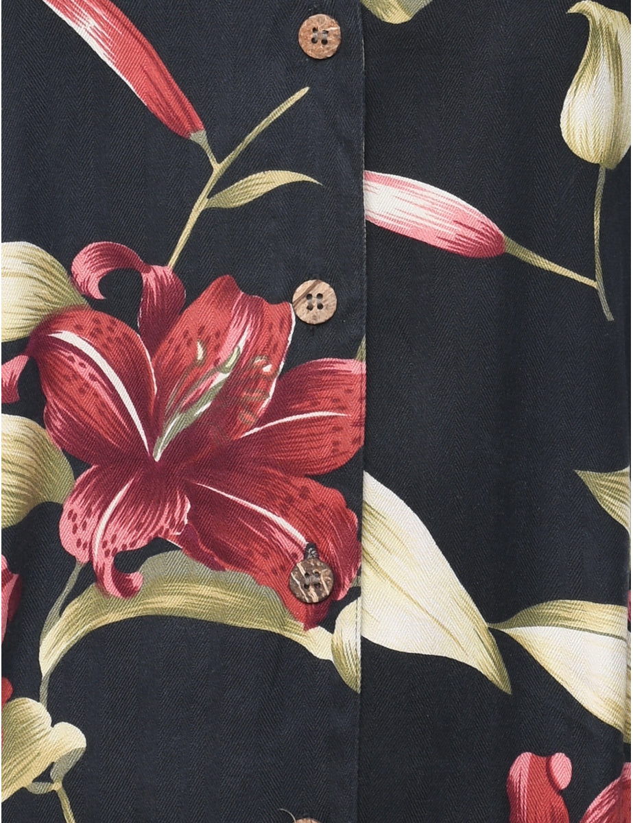 Floral hawaiian shirt comes in black with coconut buttons and a revere front.
