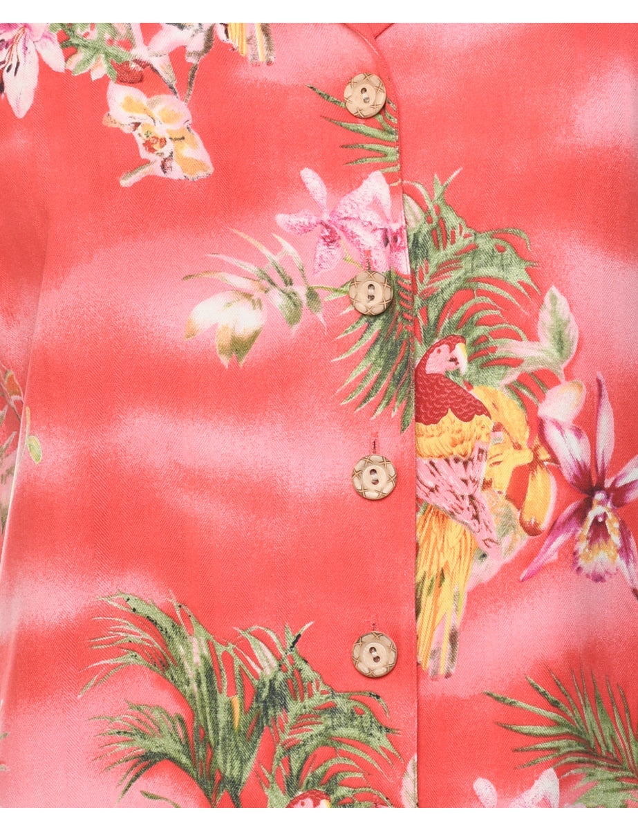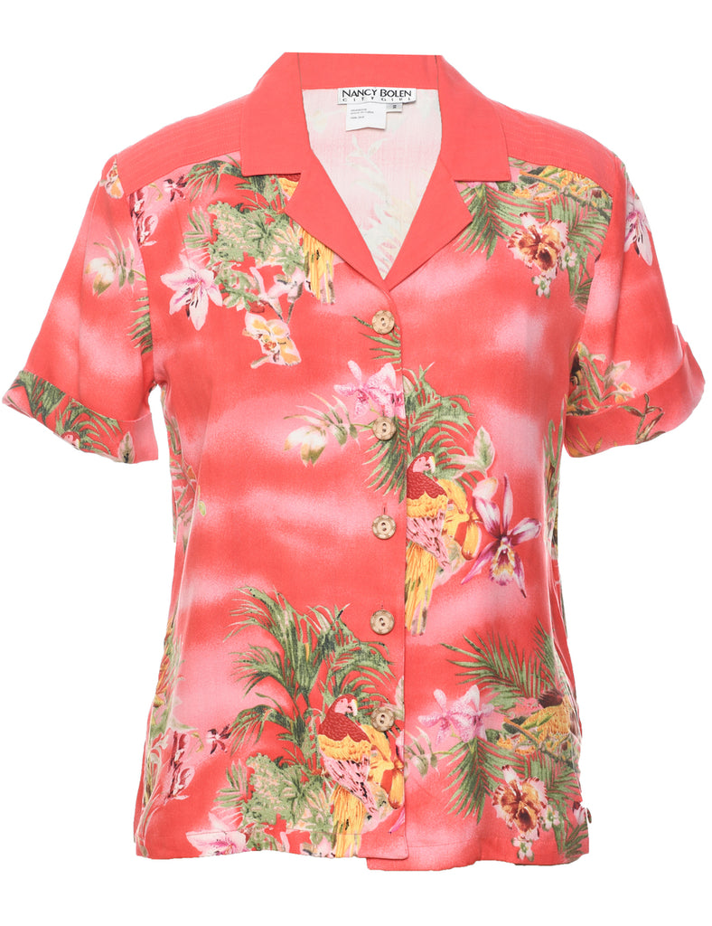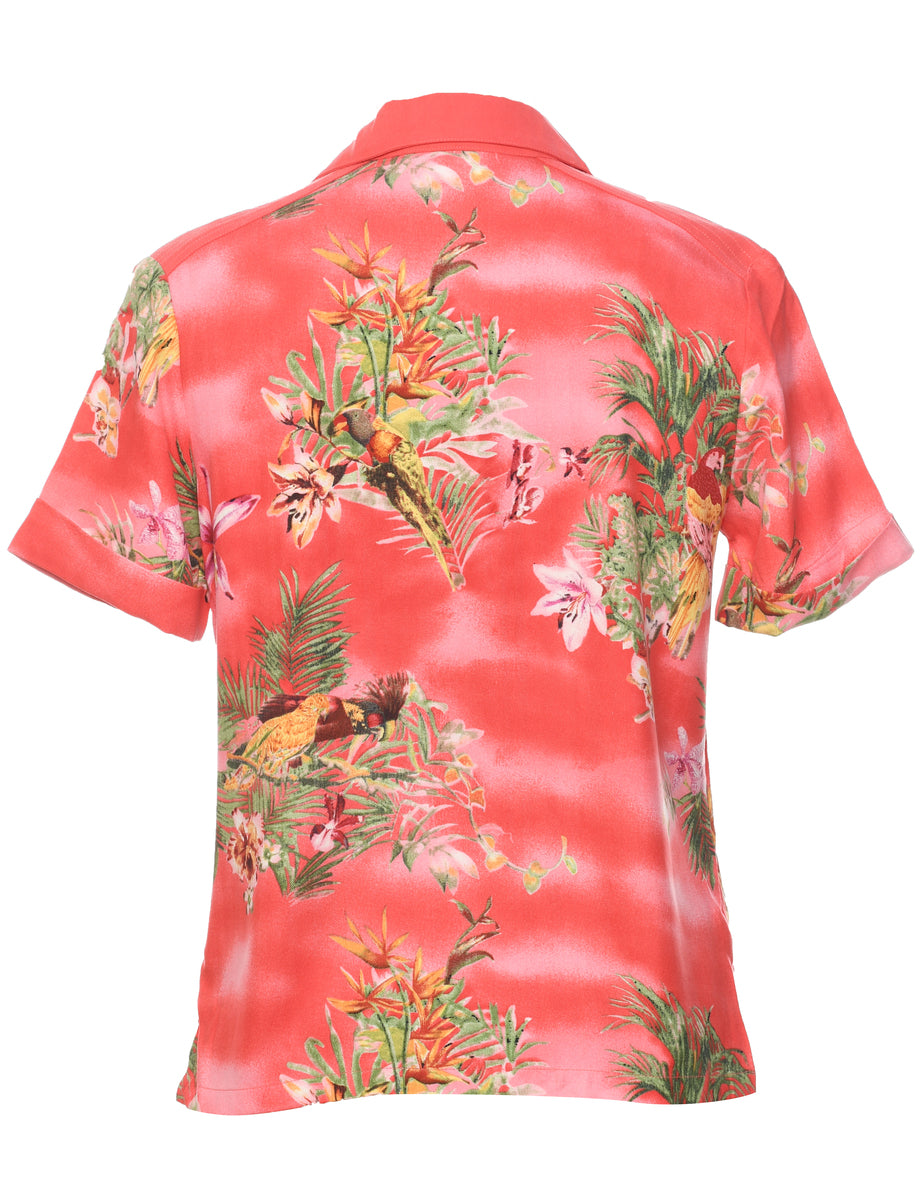 Floral hawaiian shirt comes in salmon pink with coconut buttons and removable shoulder pads.