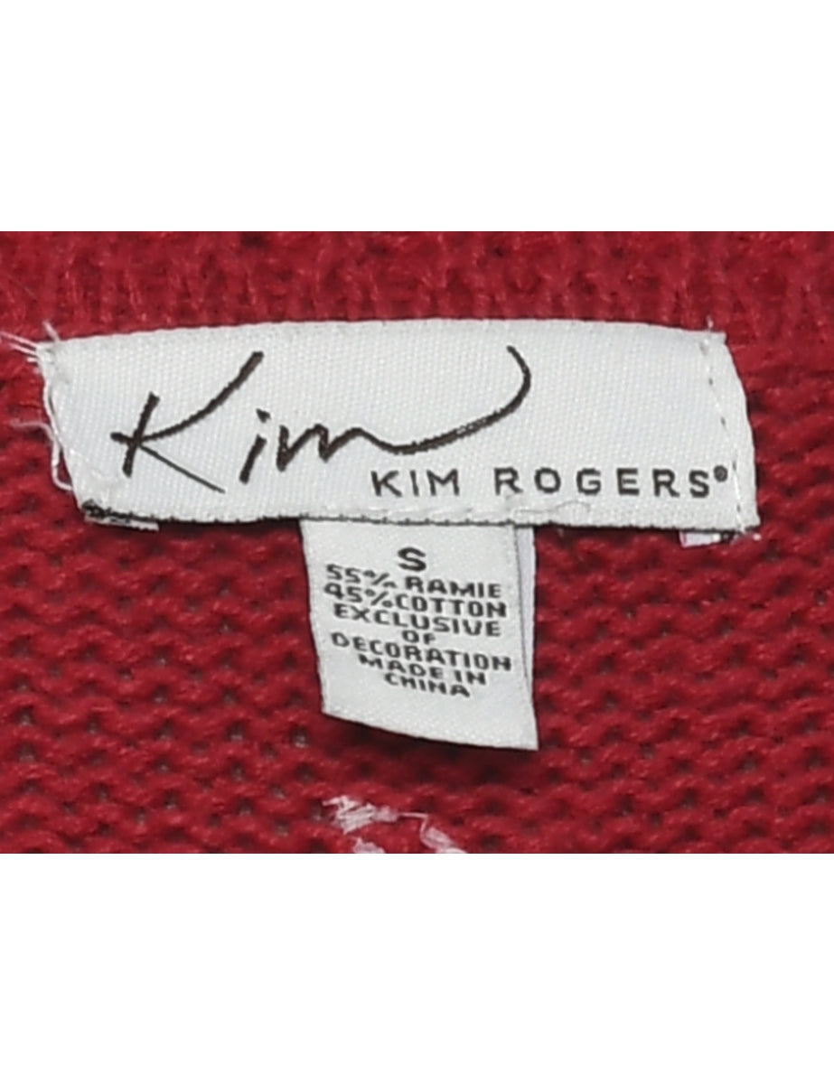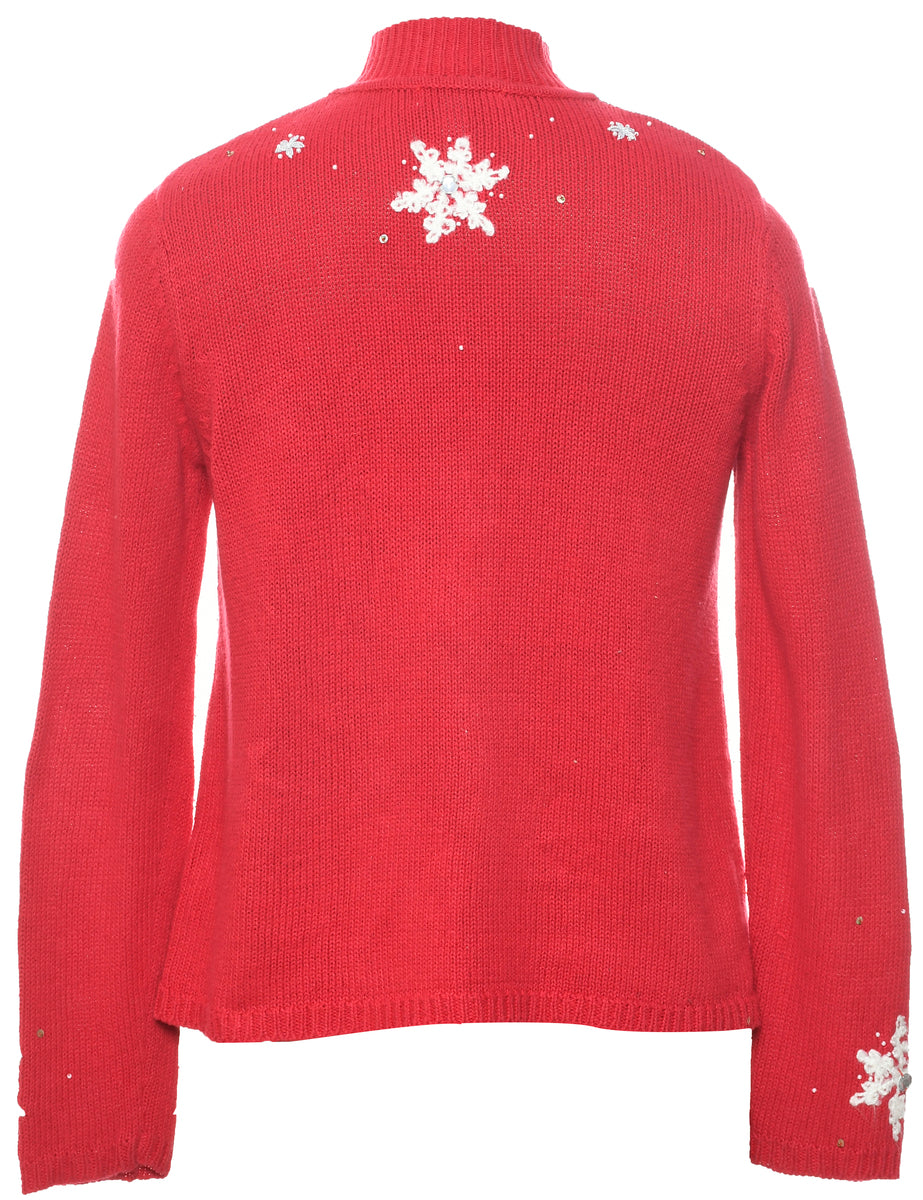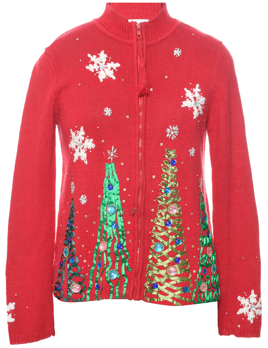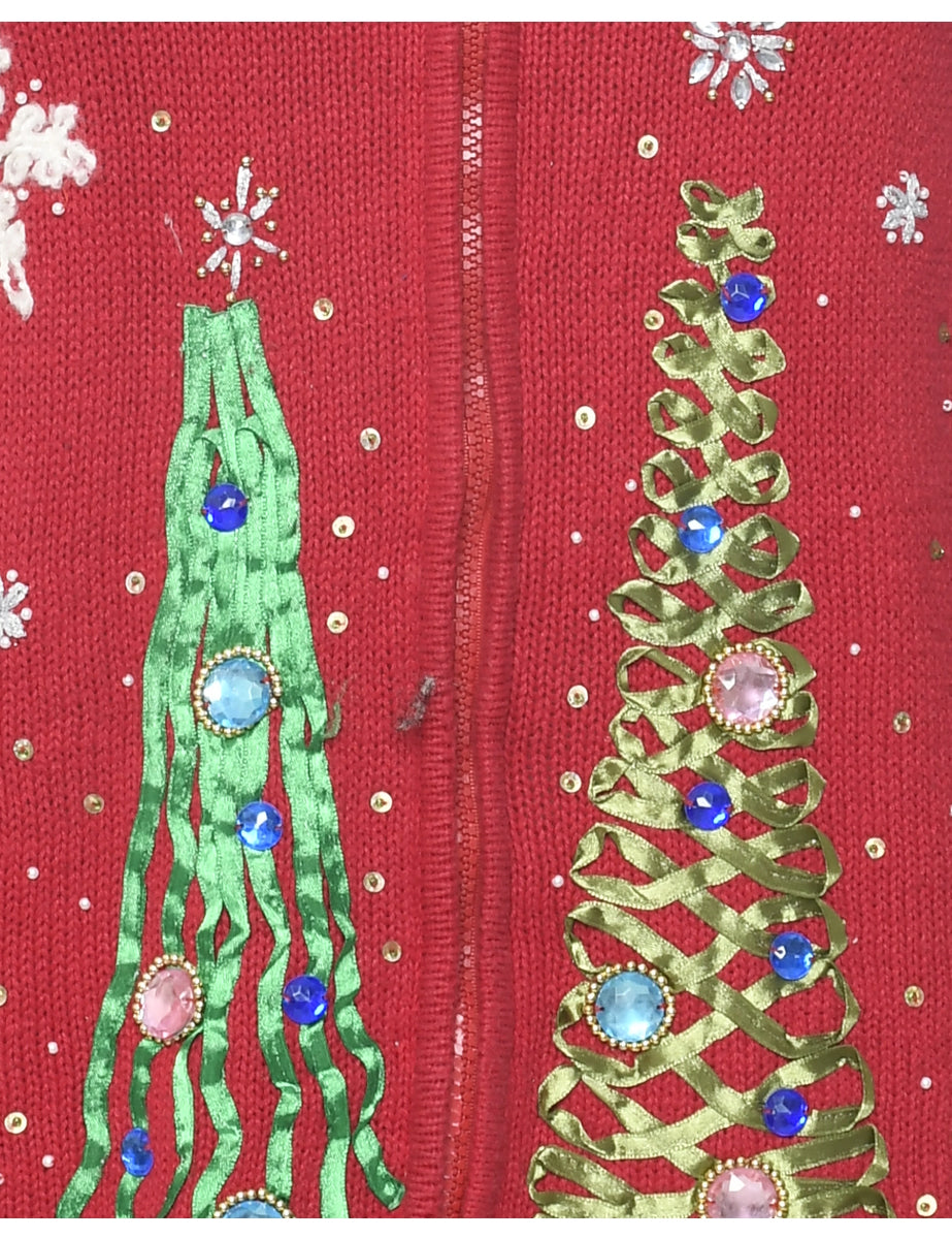 Snowfall design cardigan with christmas tree design comes in red with an applique design and decorative stitching.