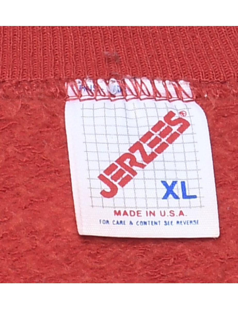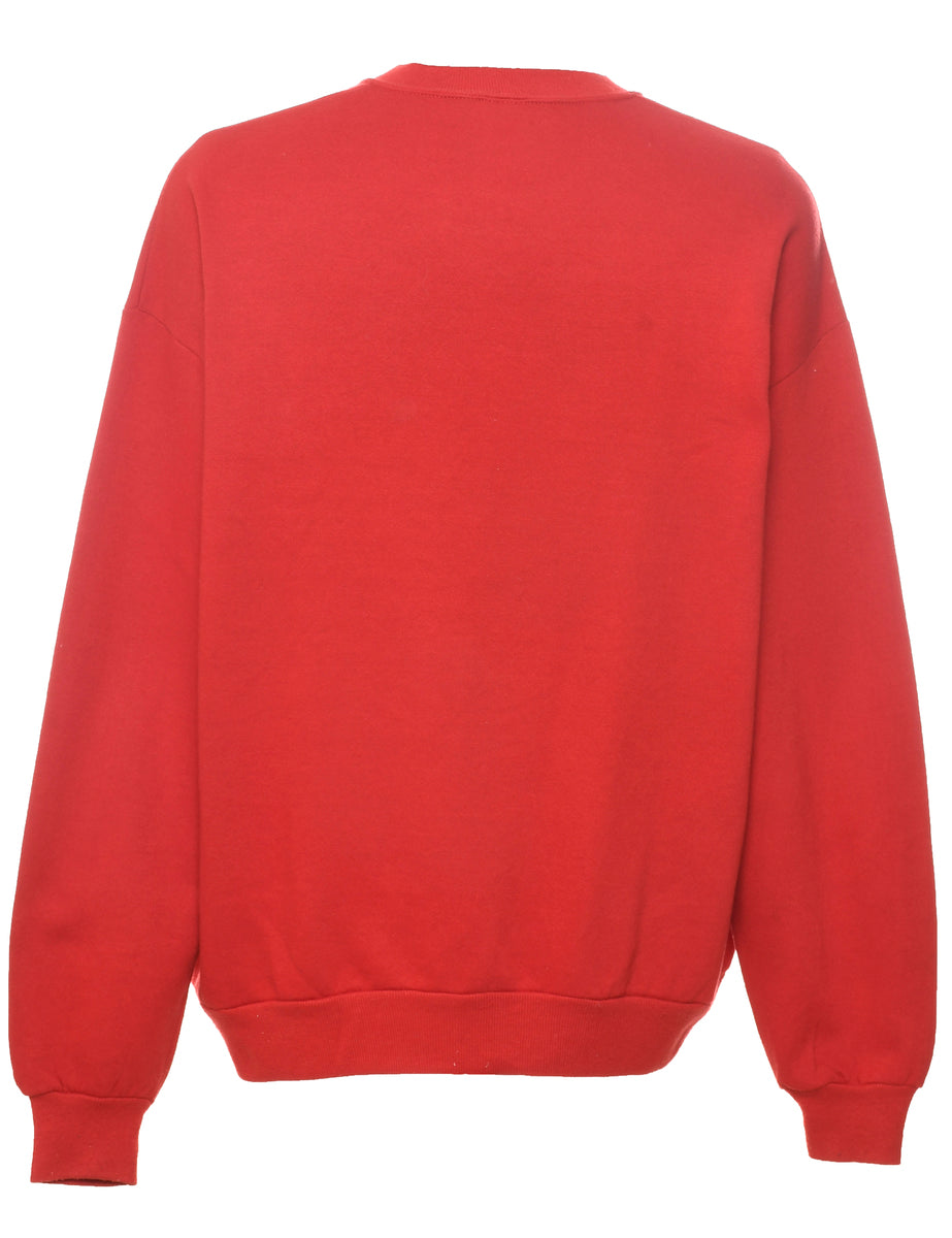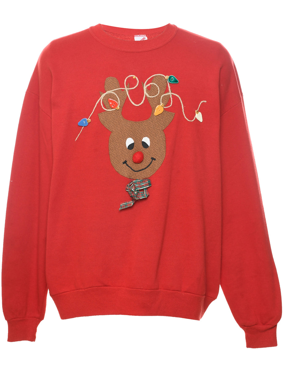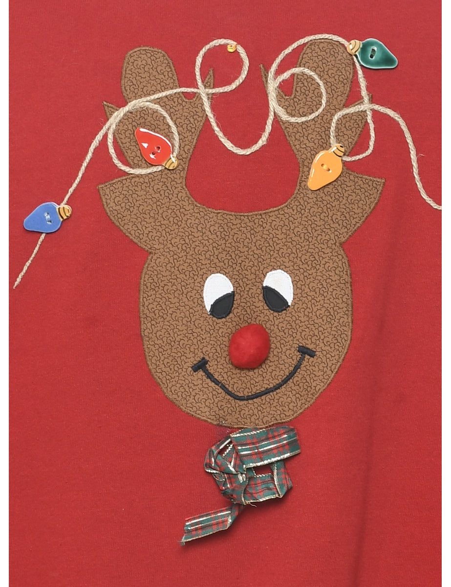 Reindeer christmas sweatshirt comes in red with an applique design and a drop shoulder.