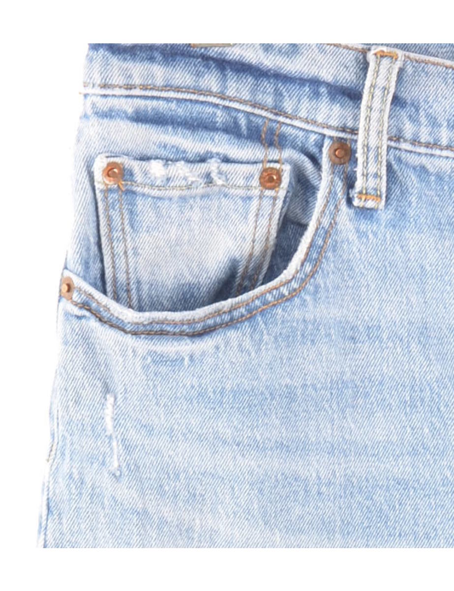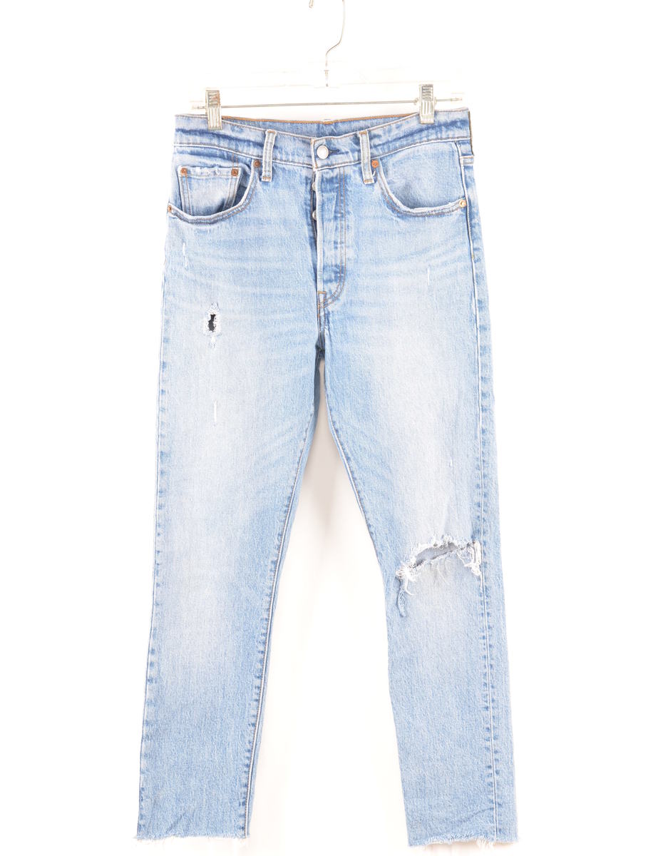 Distressed levi's jeans with 501's fit. Comes in light wash with multiple pockets.