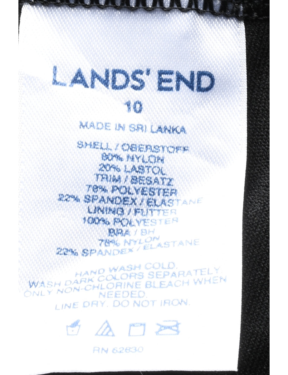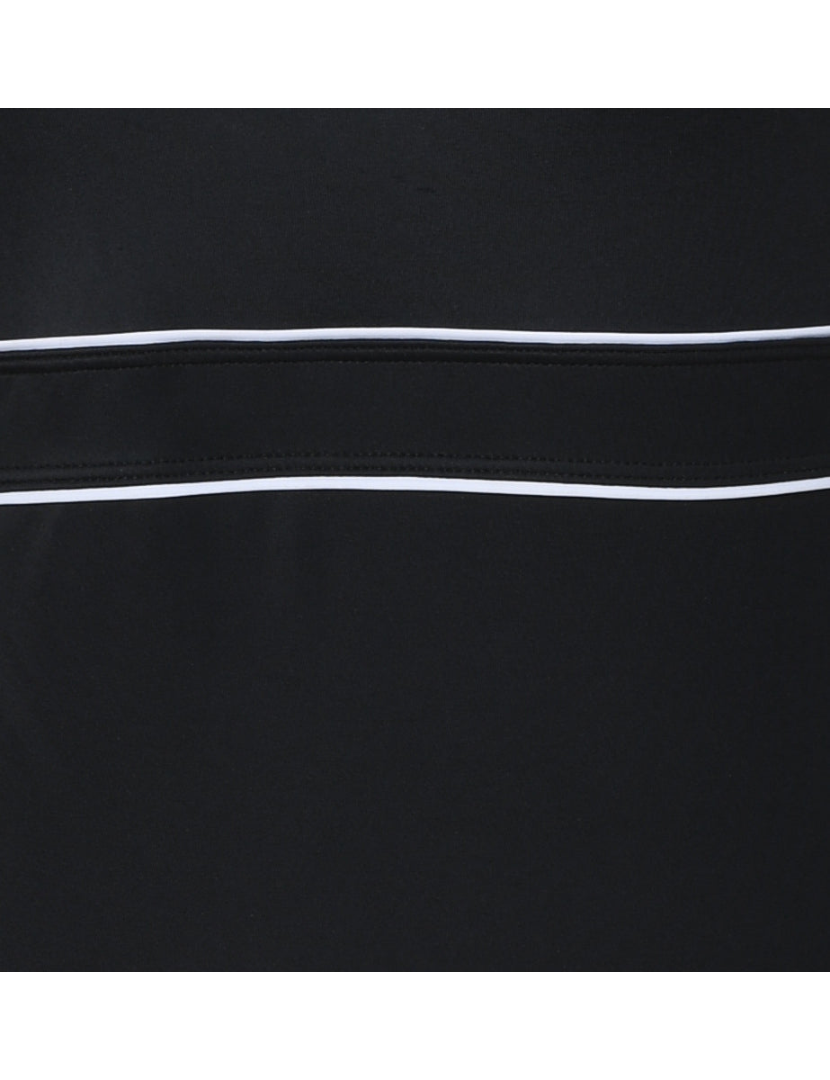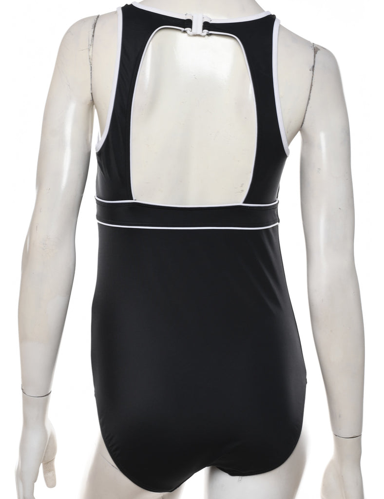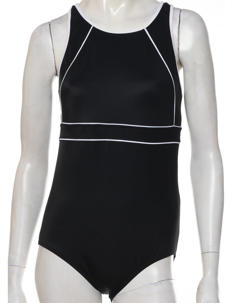 Black one-piece swimsuit with a built-in-bra and contrasting trim.