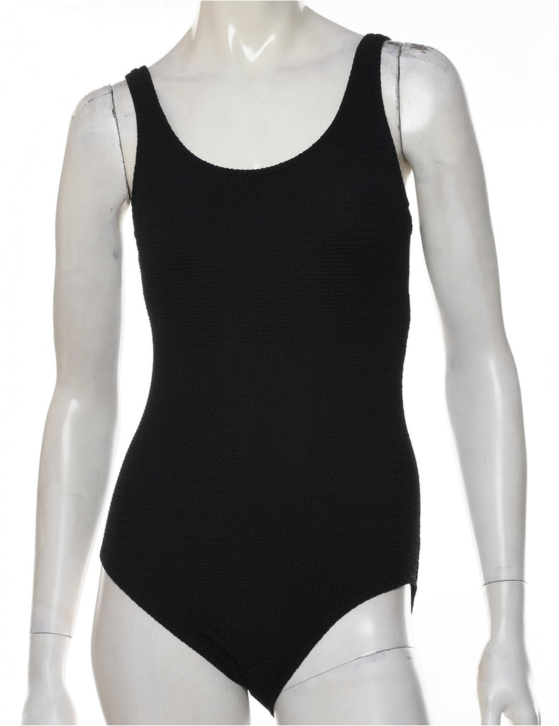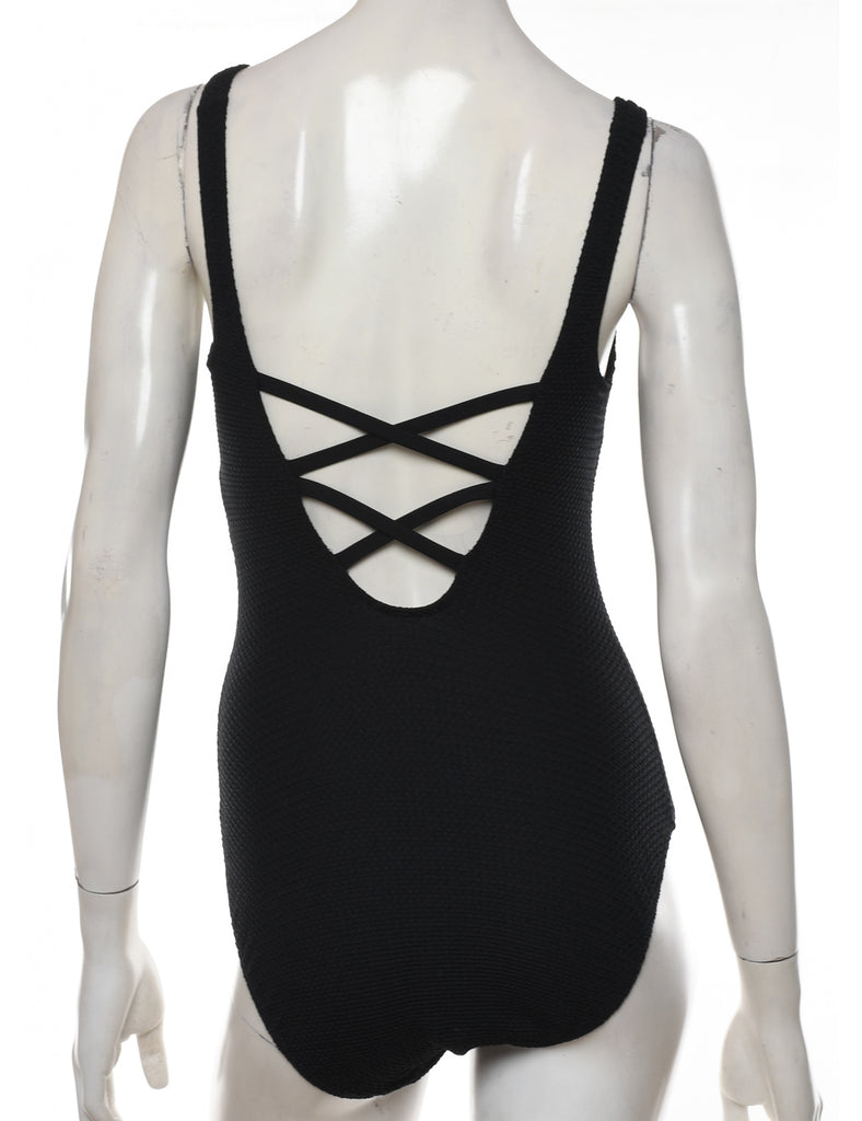 Bold one-piece swimsuit. Comes in black with a criss cross back and a built-in-bra.