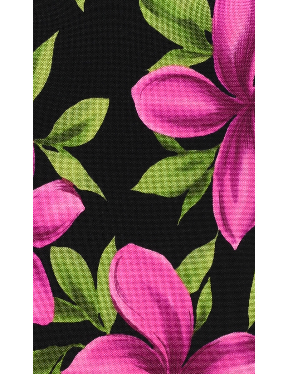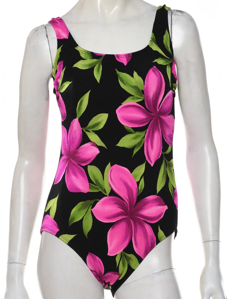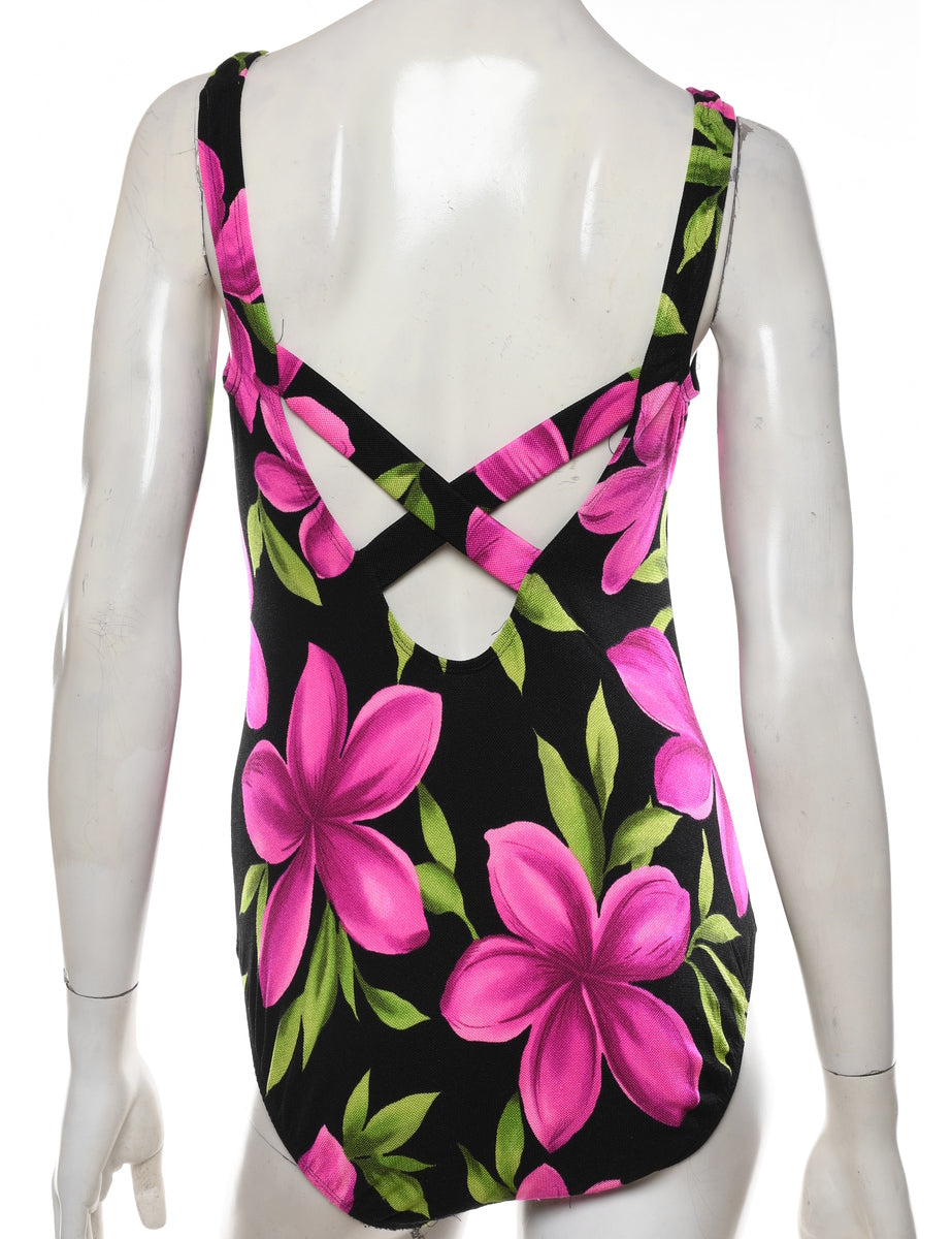Floral design pink & black one-piece swimsuit with a low back neckline.