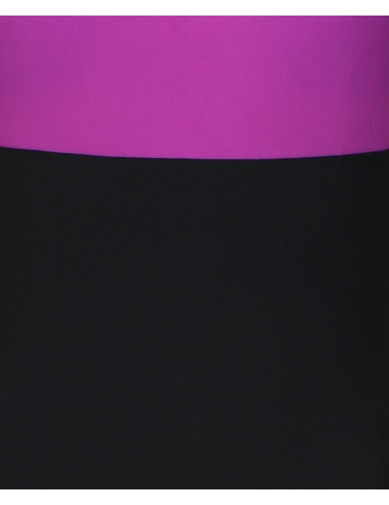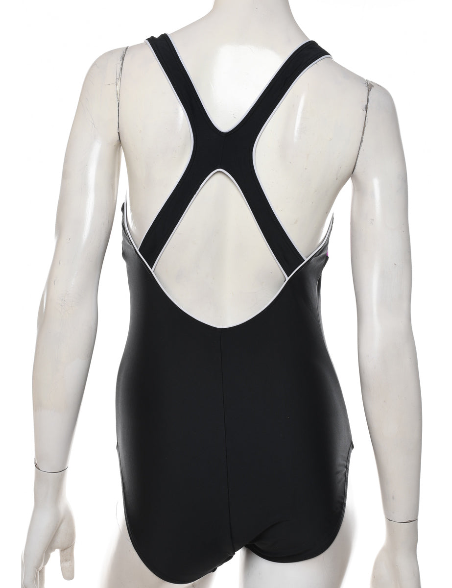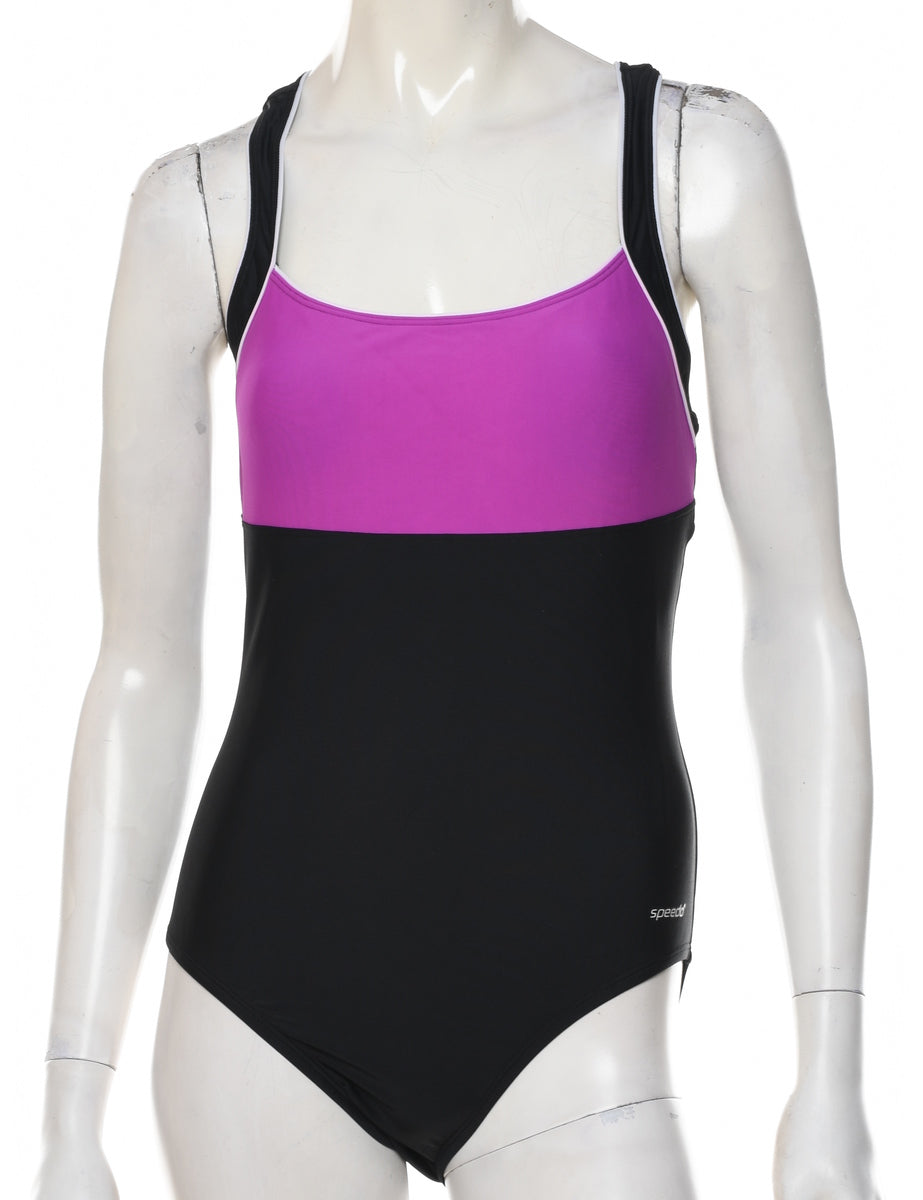 Bright one-piece swimsuit. Comes in black & purple with a criss cross back and a built-in-bra.