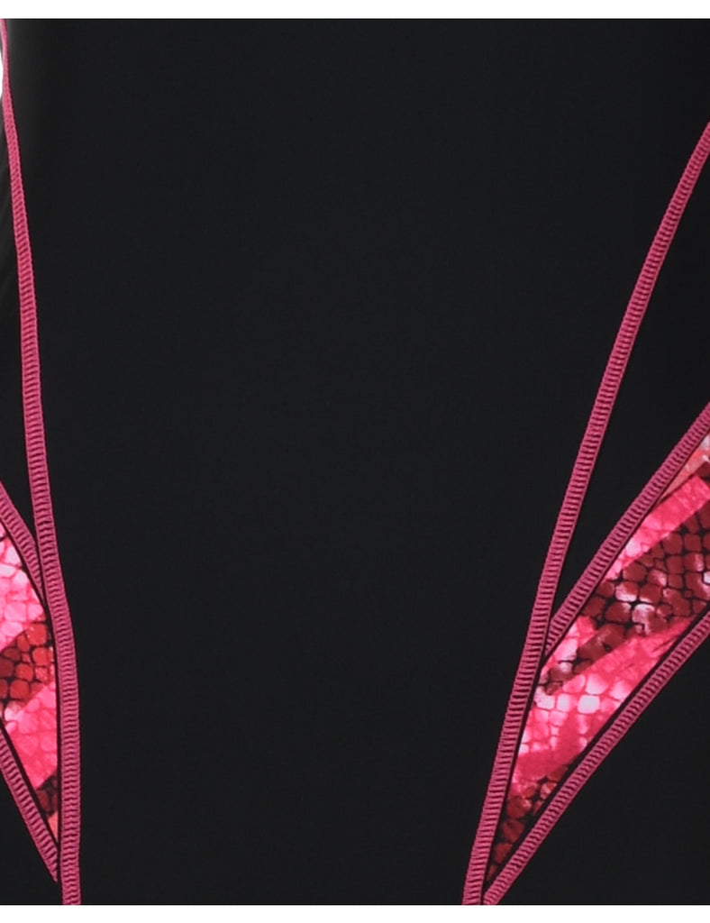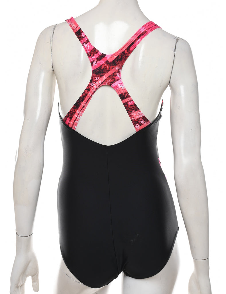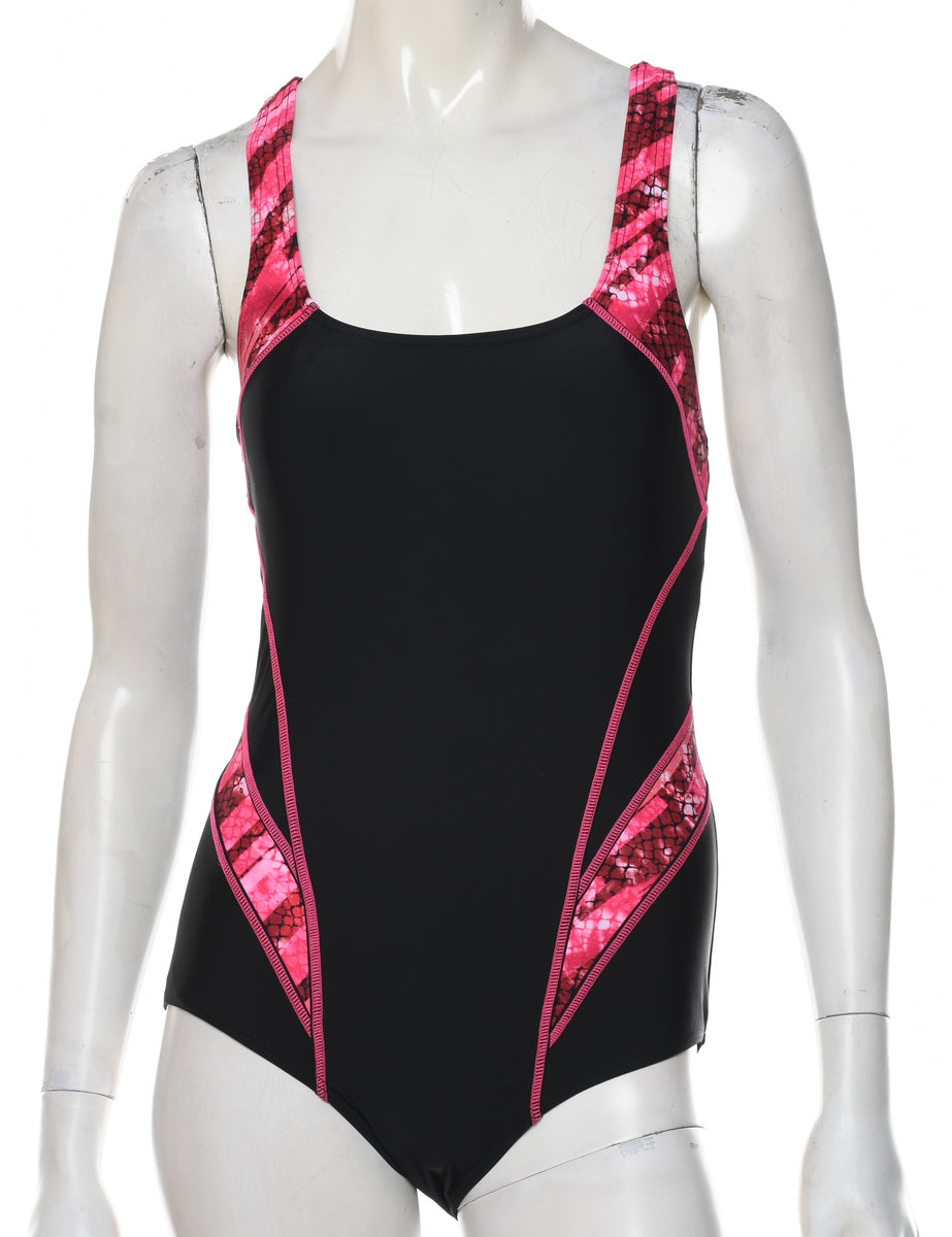 Bold one-piece swimsuit. Comes in black & pink with a built-in-bra.