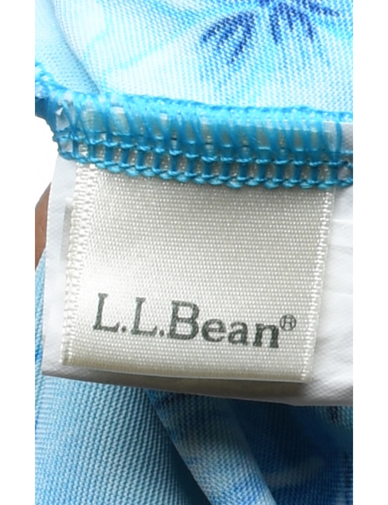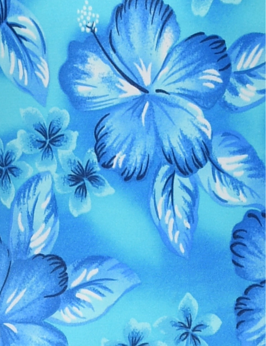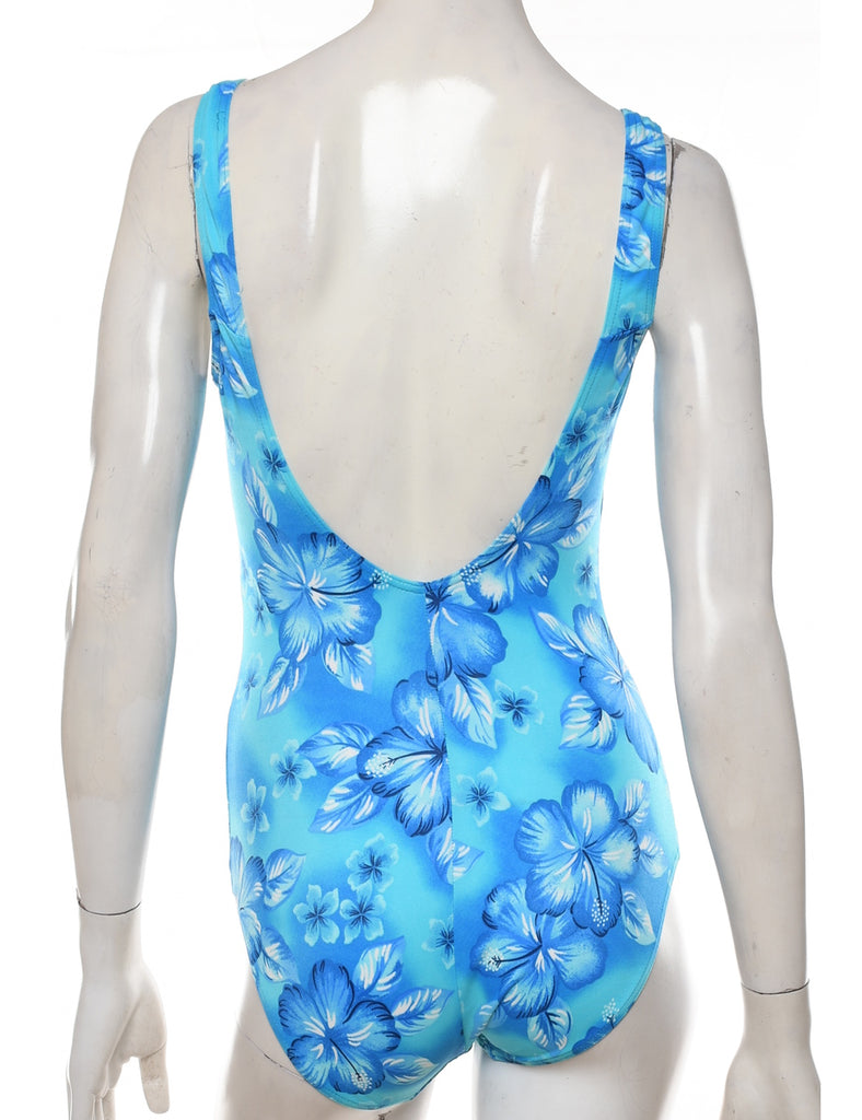 Floral one-piece swimsuit in light blue with a low back neckline.