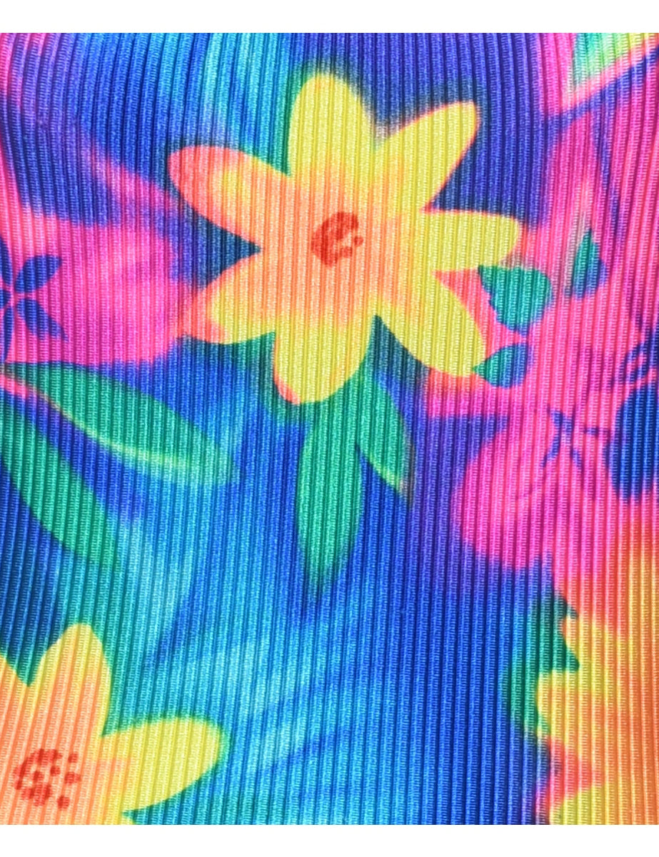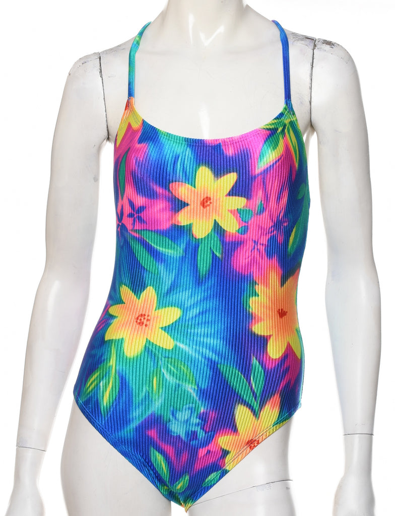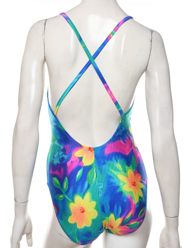 Floral multi-colour one-piece swimsuit with a criss cross back.
