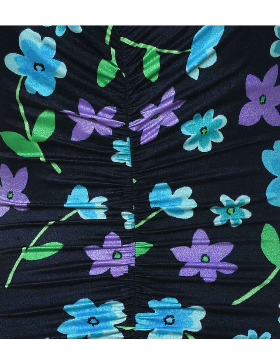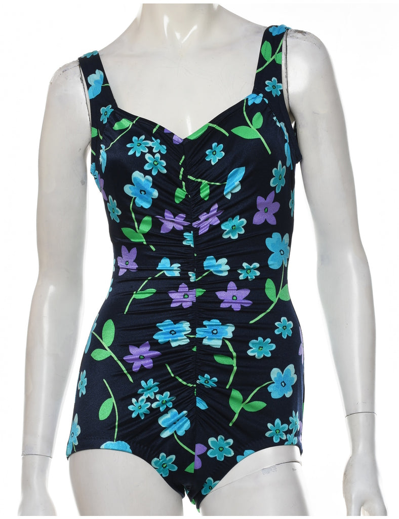 Floral one-piece swimsuit. Comes in black with a built-in-bra and ruched detailing.