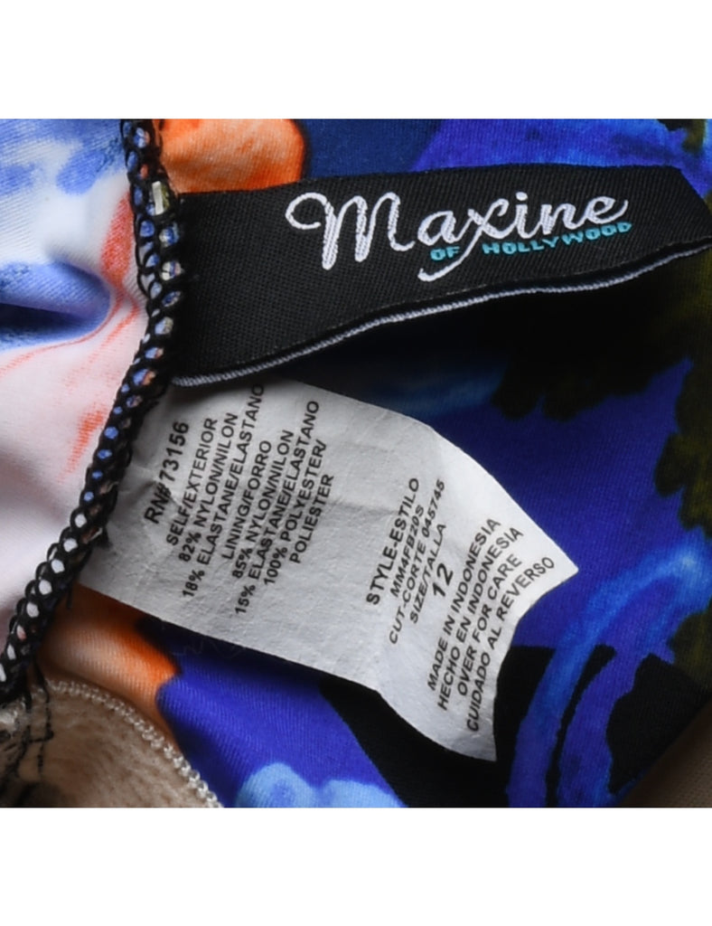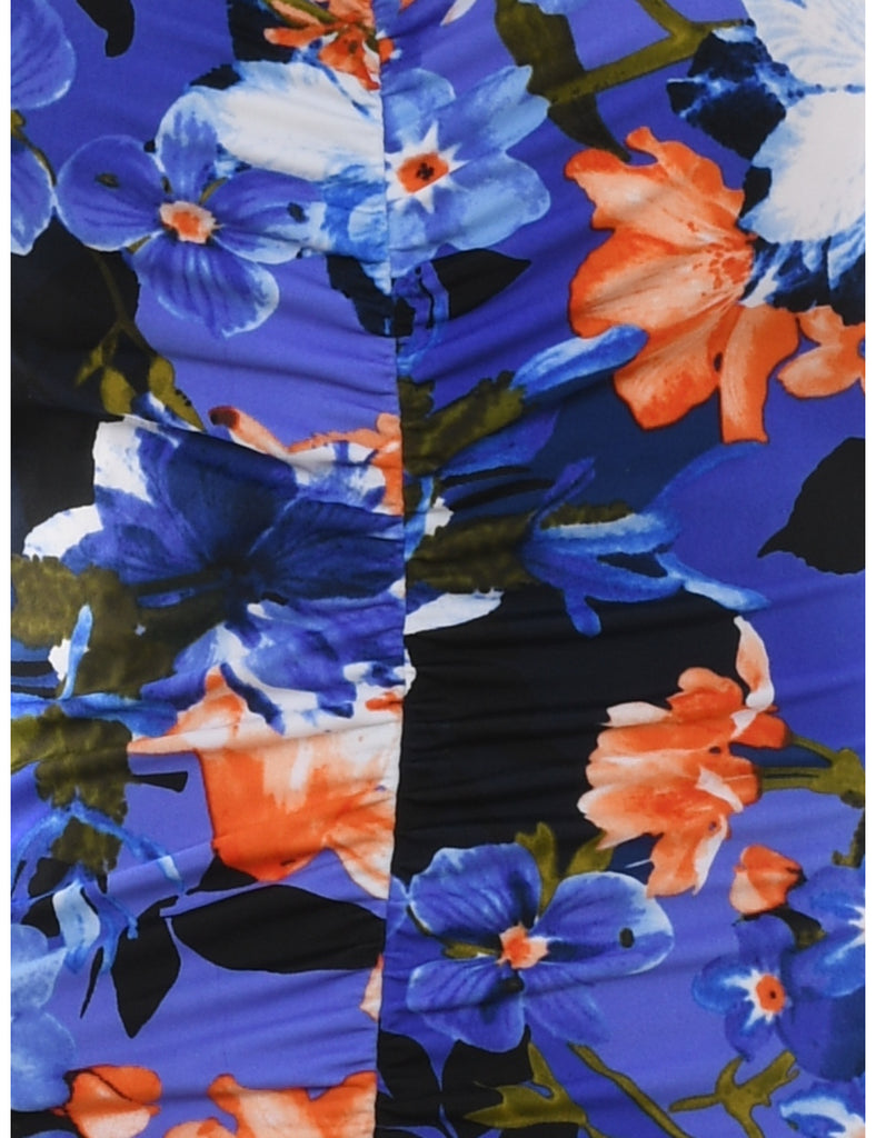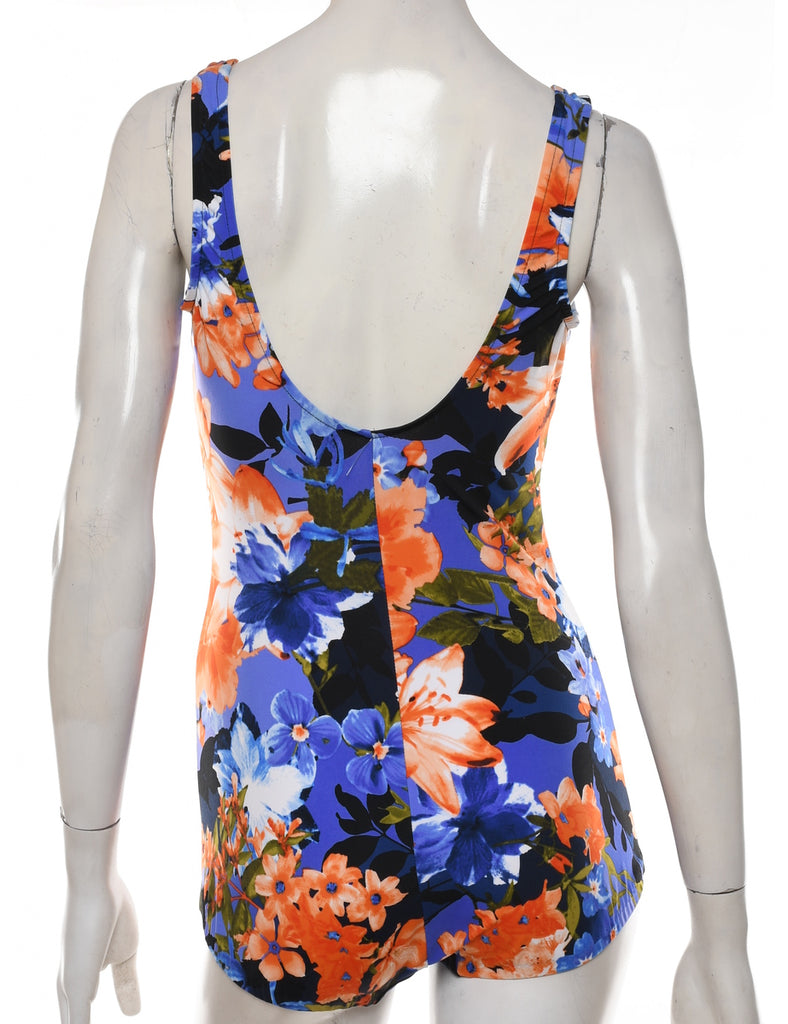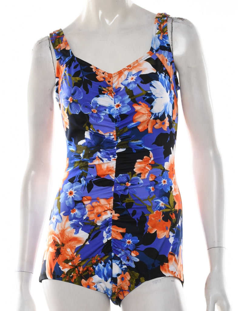 Floral one-piece swimsuit. Comes in blue with a built-in-bra and ruched detailing.
