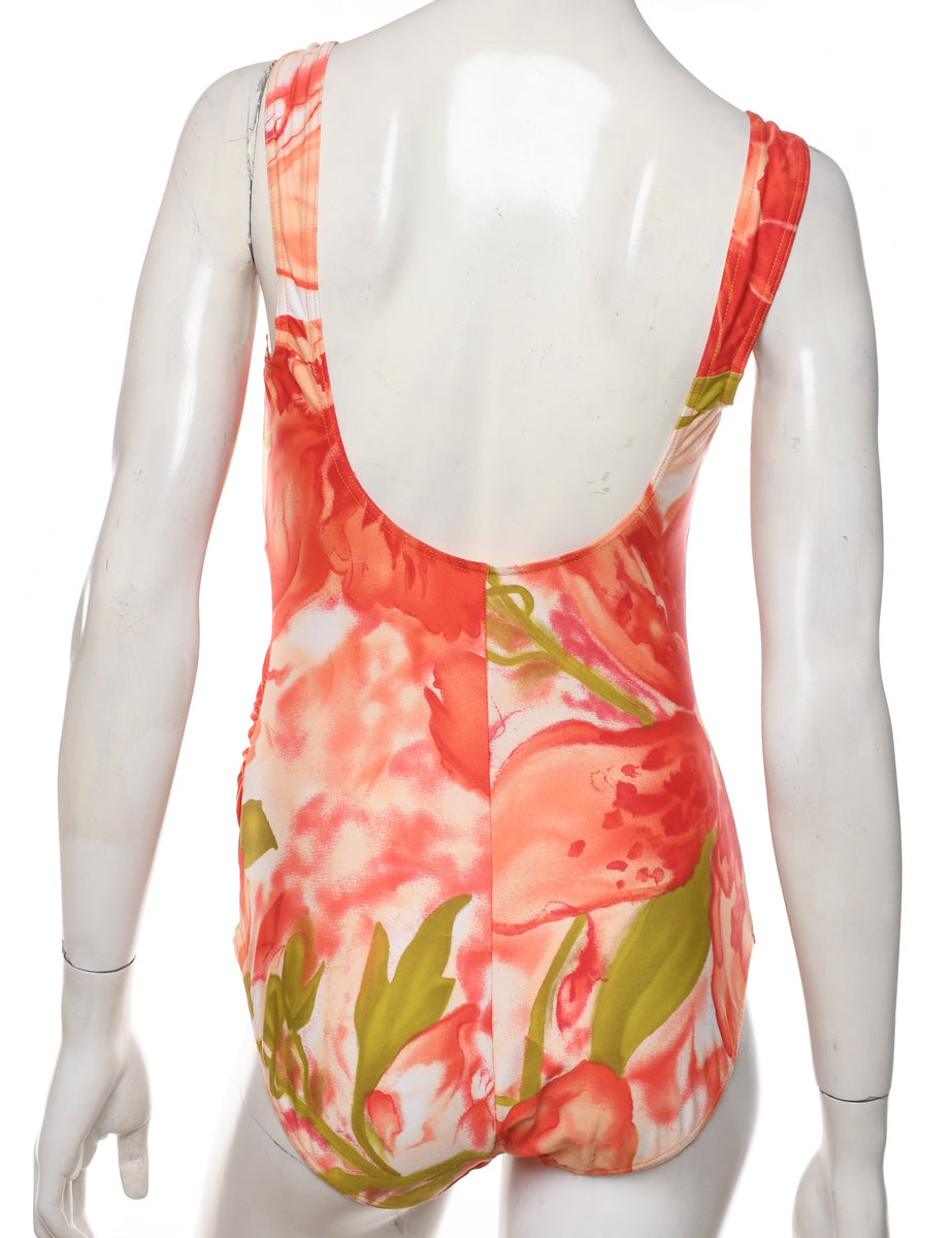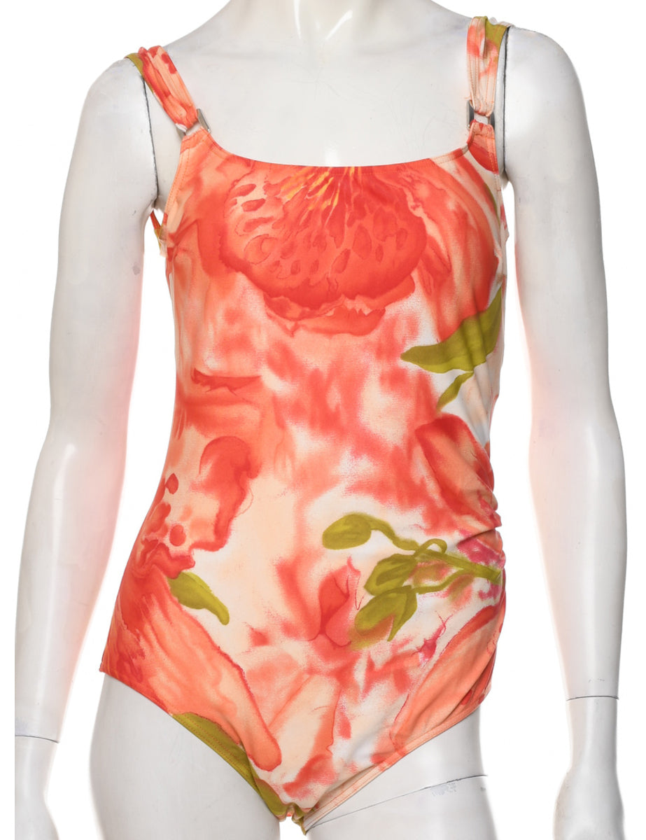Leafy print one-piece swimsuit. Comes in orange with a built-in-bra.