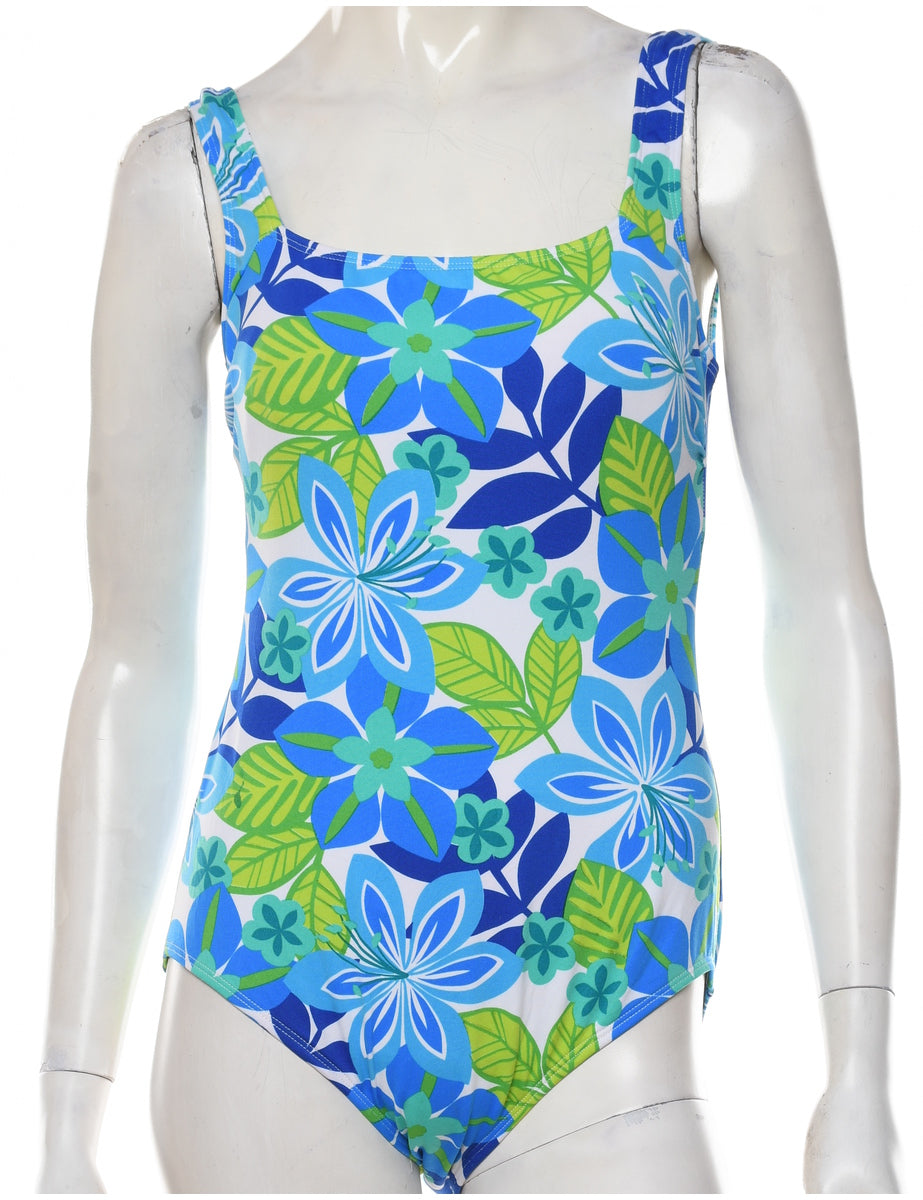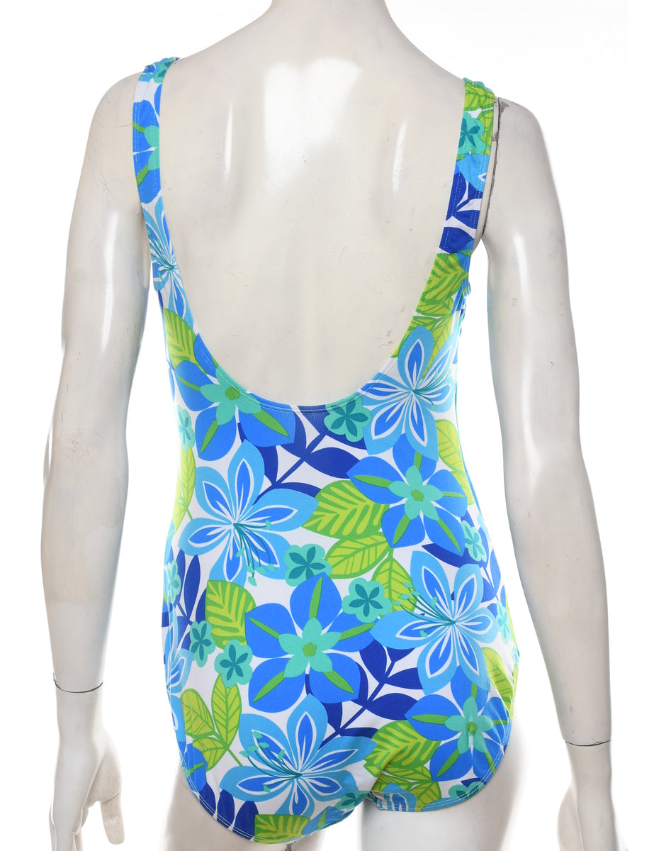 Leafy print multi-colour one-piece swimsuit with a low back neckline.