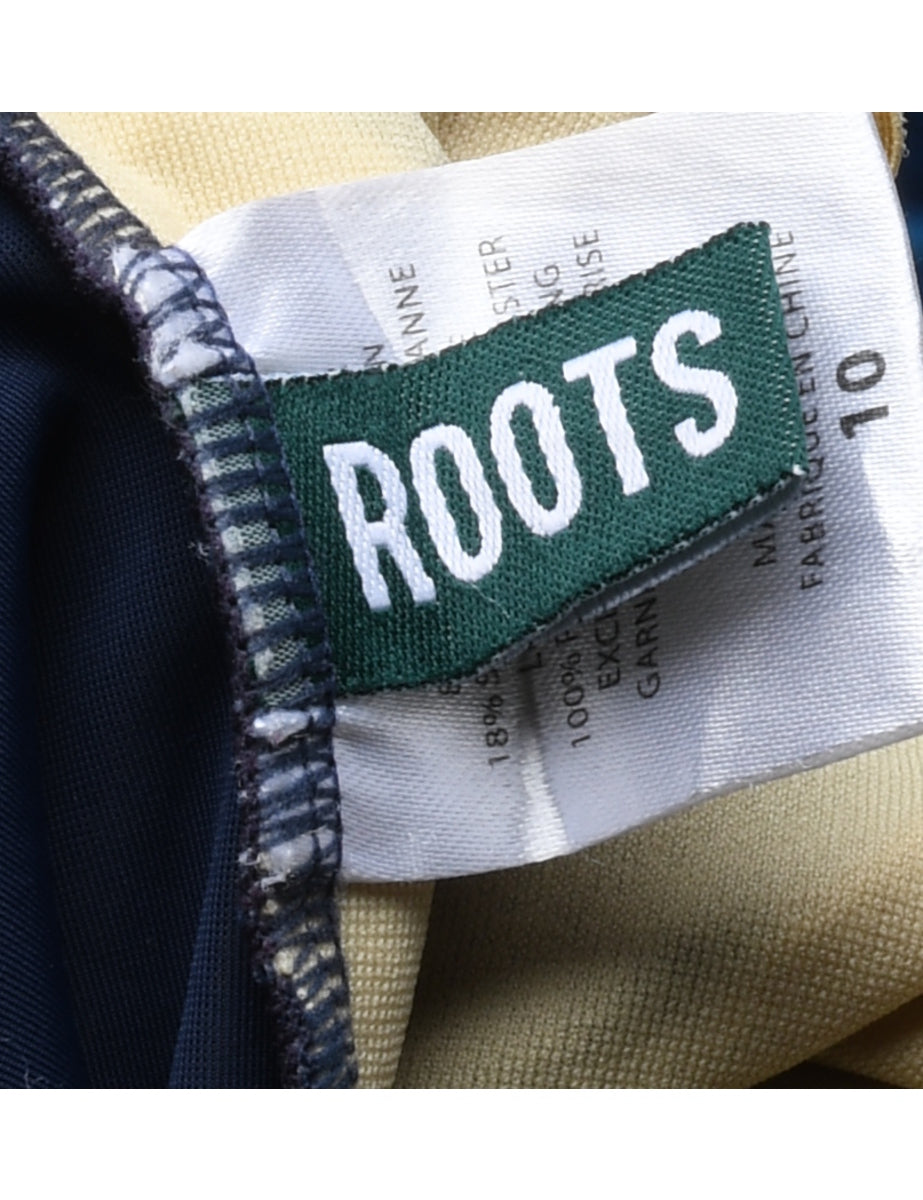 One-piece swimsuit. Comes in navy with a criss cross back and a built-in-bra.