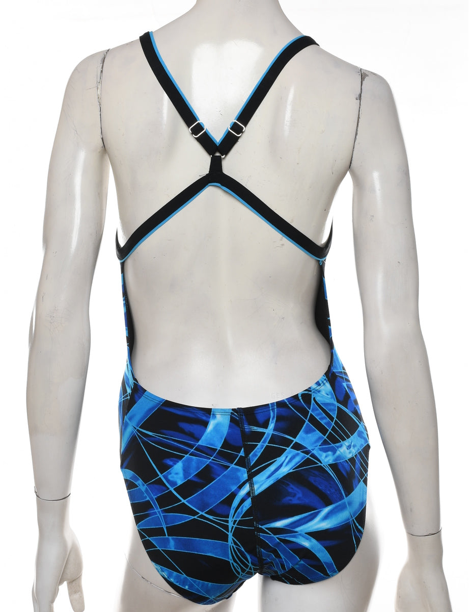 Bold one-piece swimsuit. Comes in black & blue with adjustable straps.