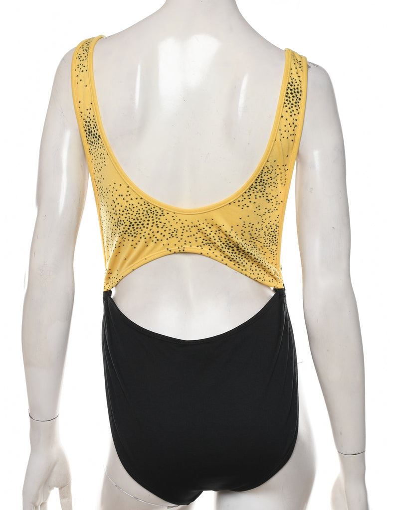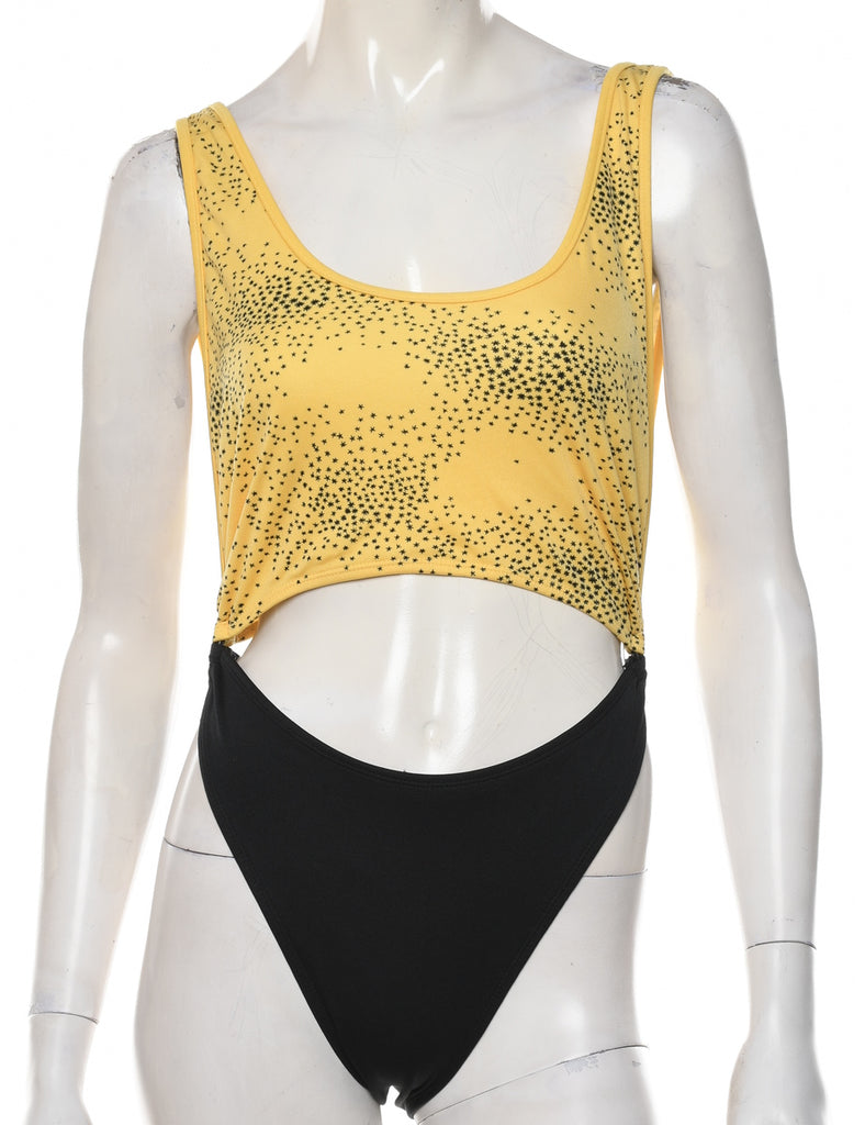 Bold one-piece swimsuit. Comes in yellow & black with cut out detailing.