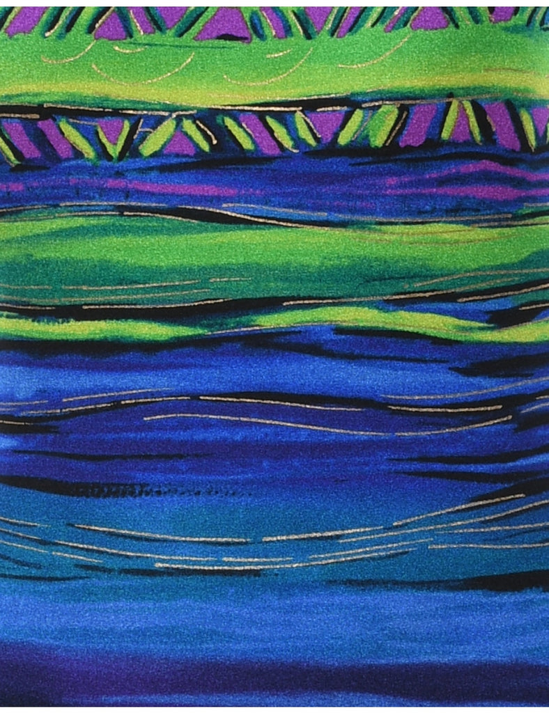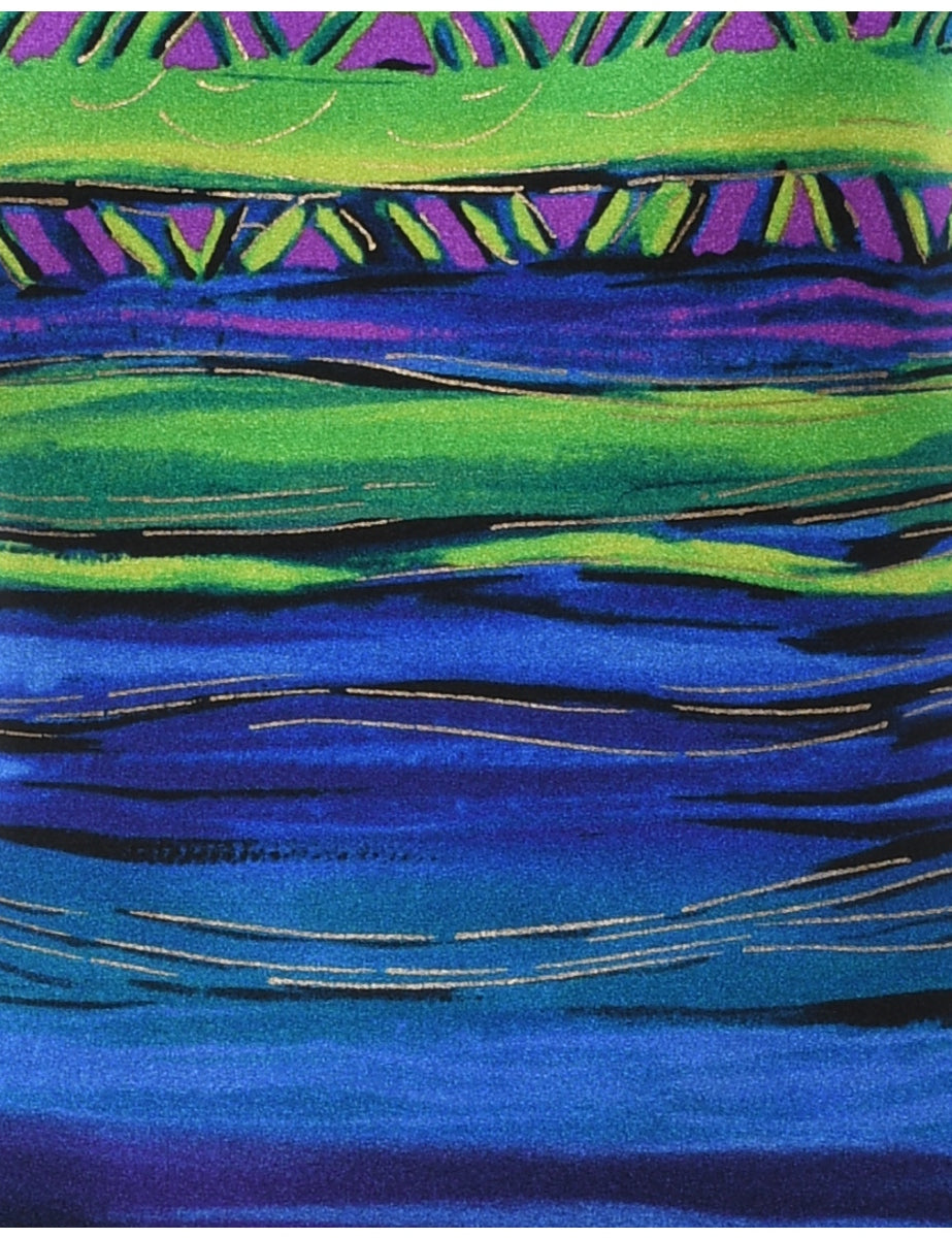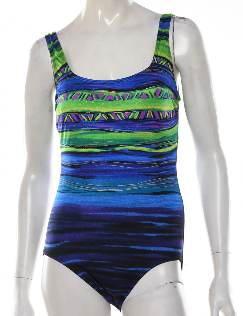 Striped blue one-piece swimsuit with a criss cross back and a built-in-bra.