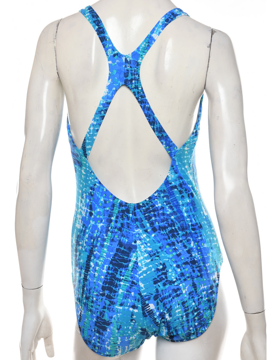 Tie dyed blue one-piece swimsuit with full lining and a built-in-bra.