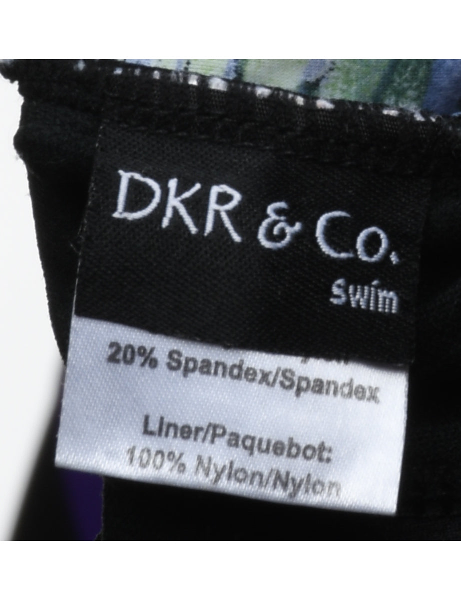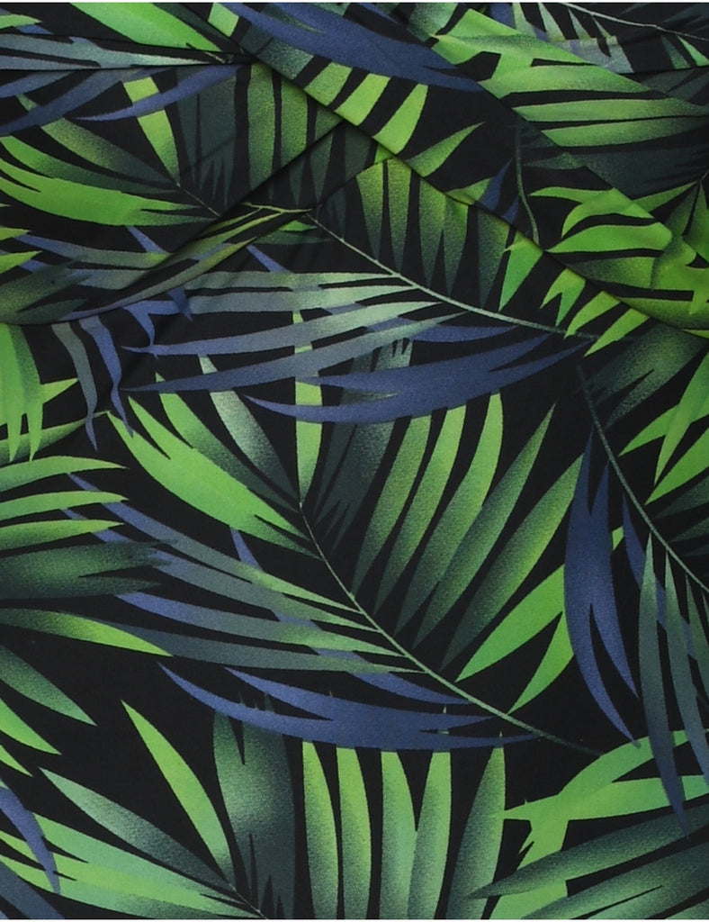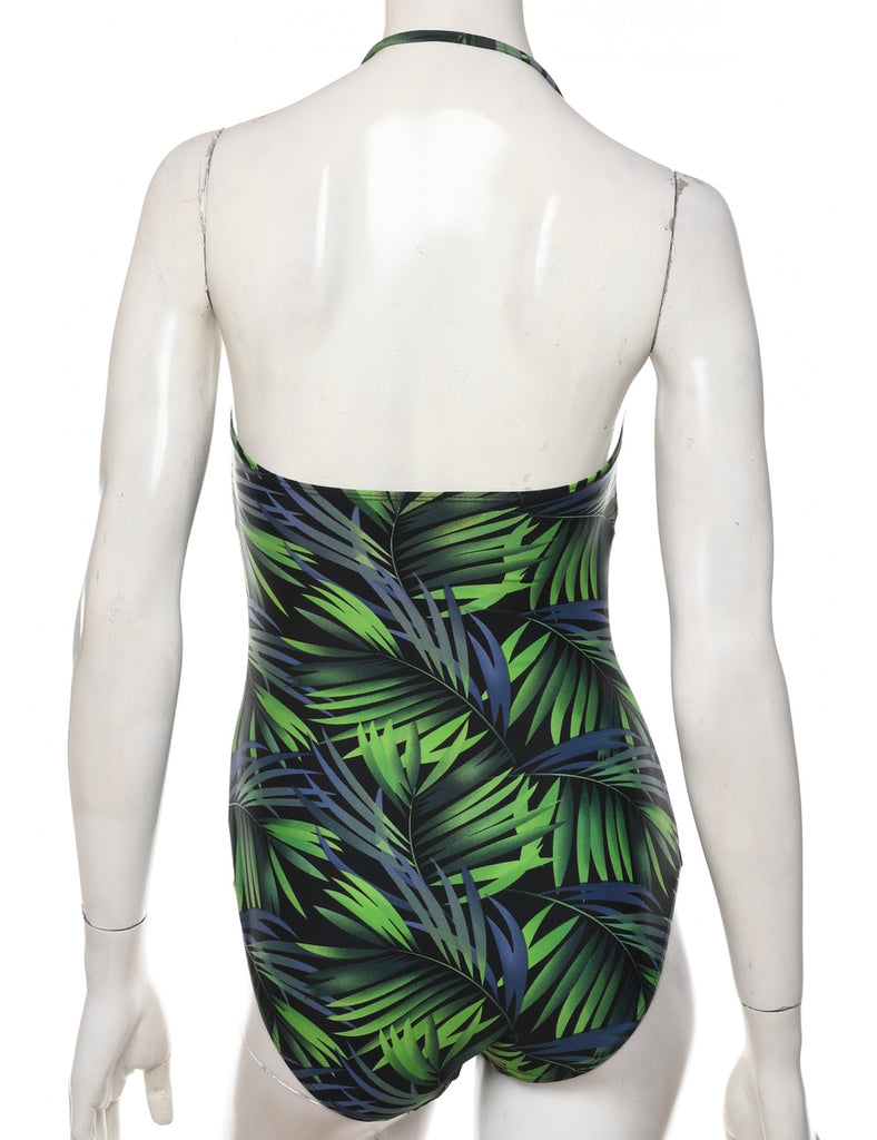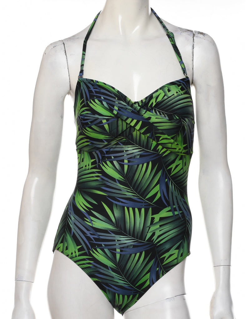 Tropical black & green one-piece swimsuit with a halterneck and a built-in-bra.