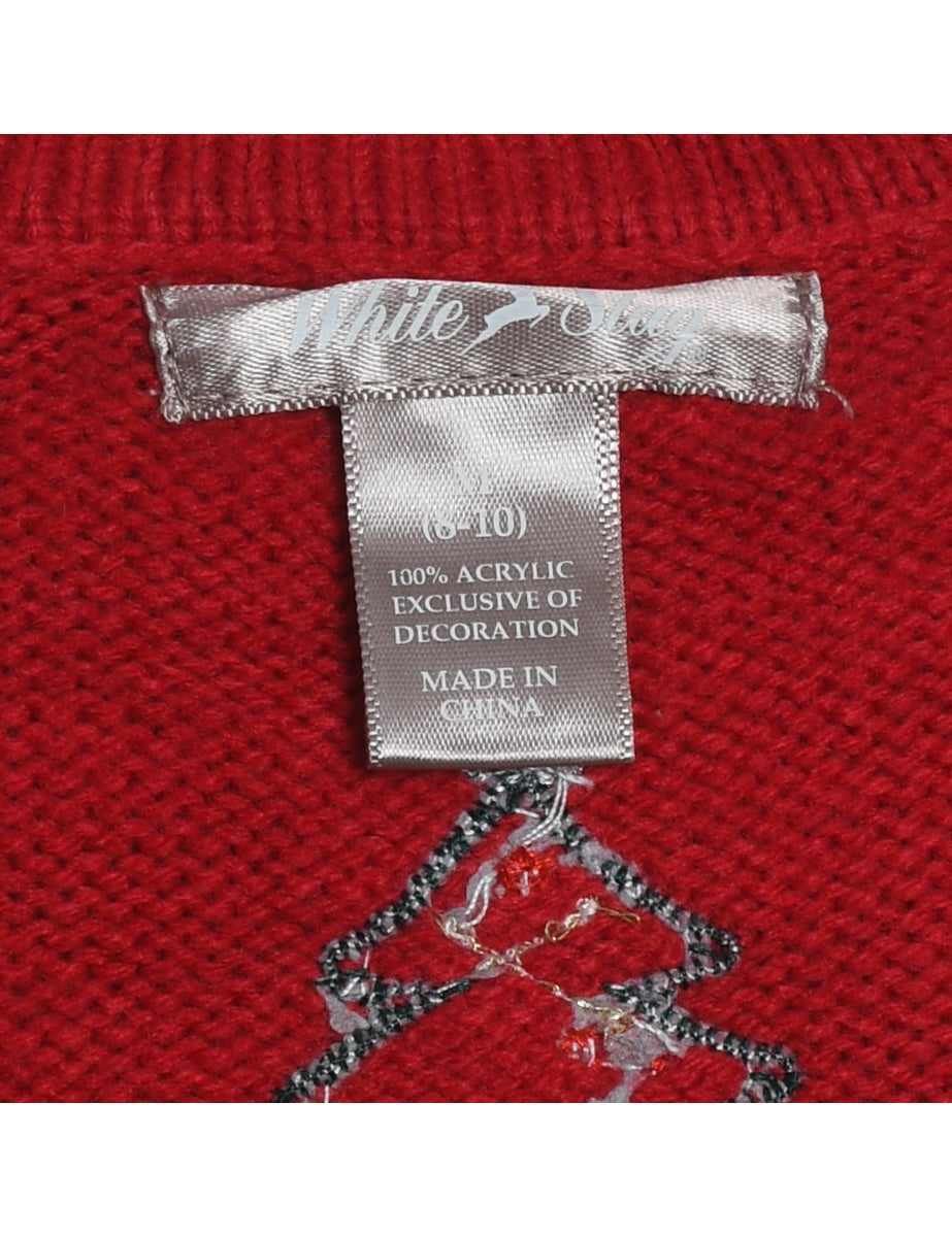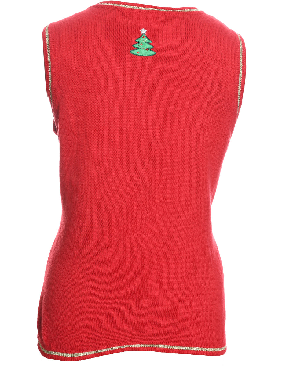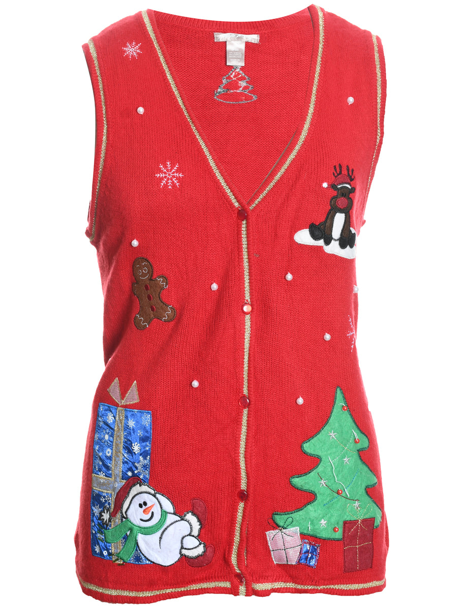 Snowman christmas sweater vest in red with a v-neck and beading.