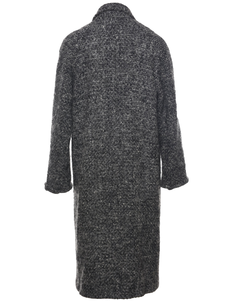 Double breasted wool coat comes in grey with multiple pockets and raglan sleeves.