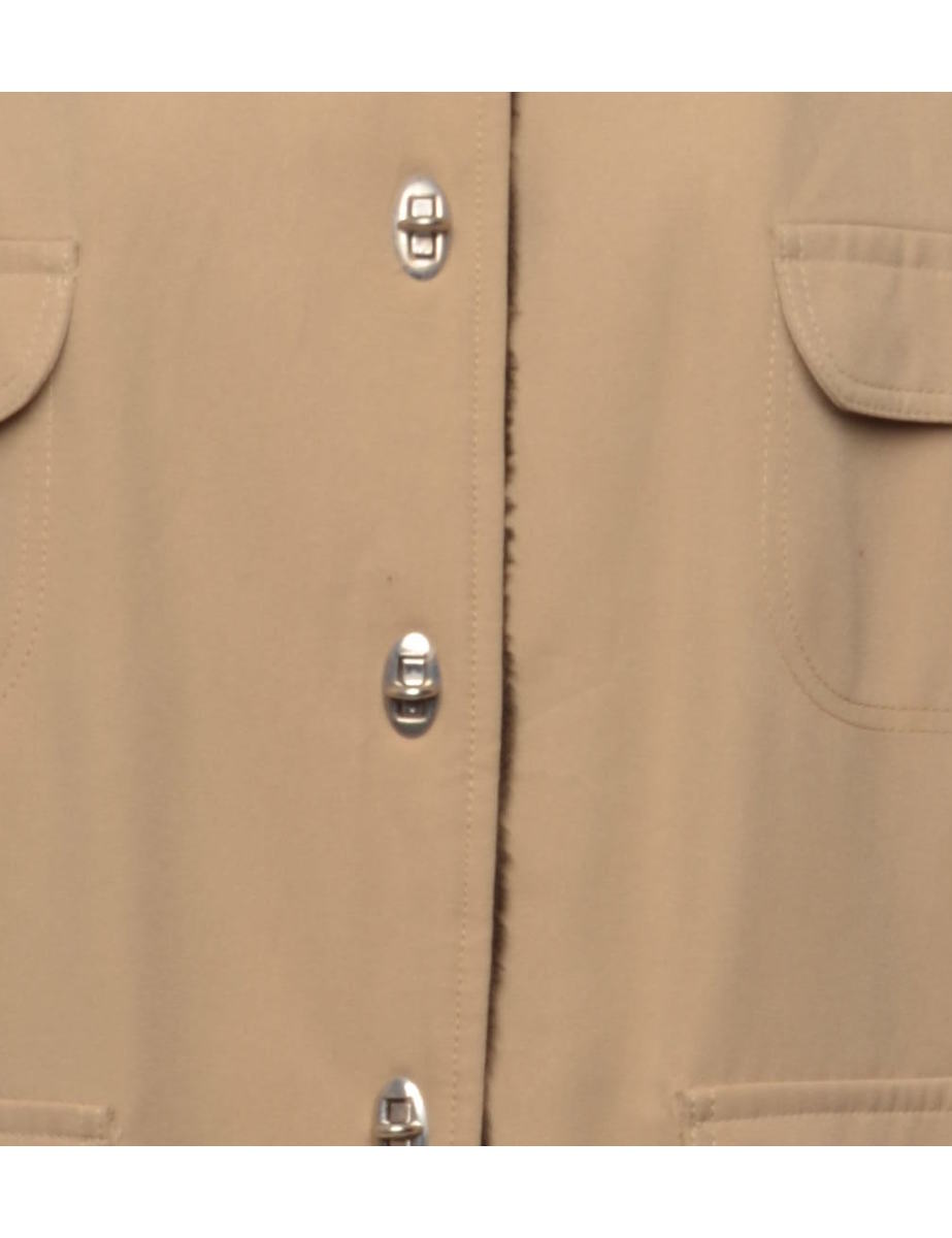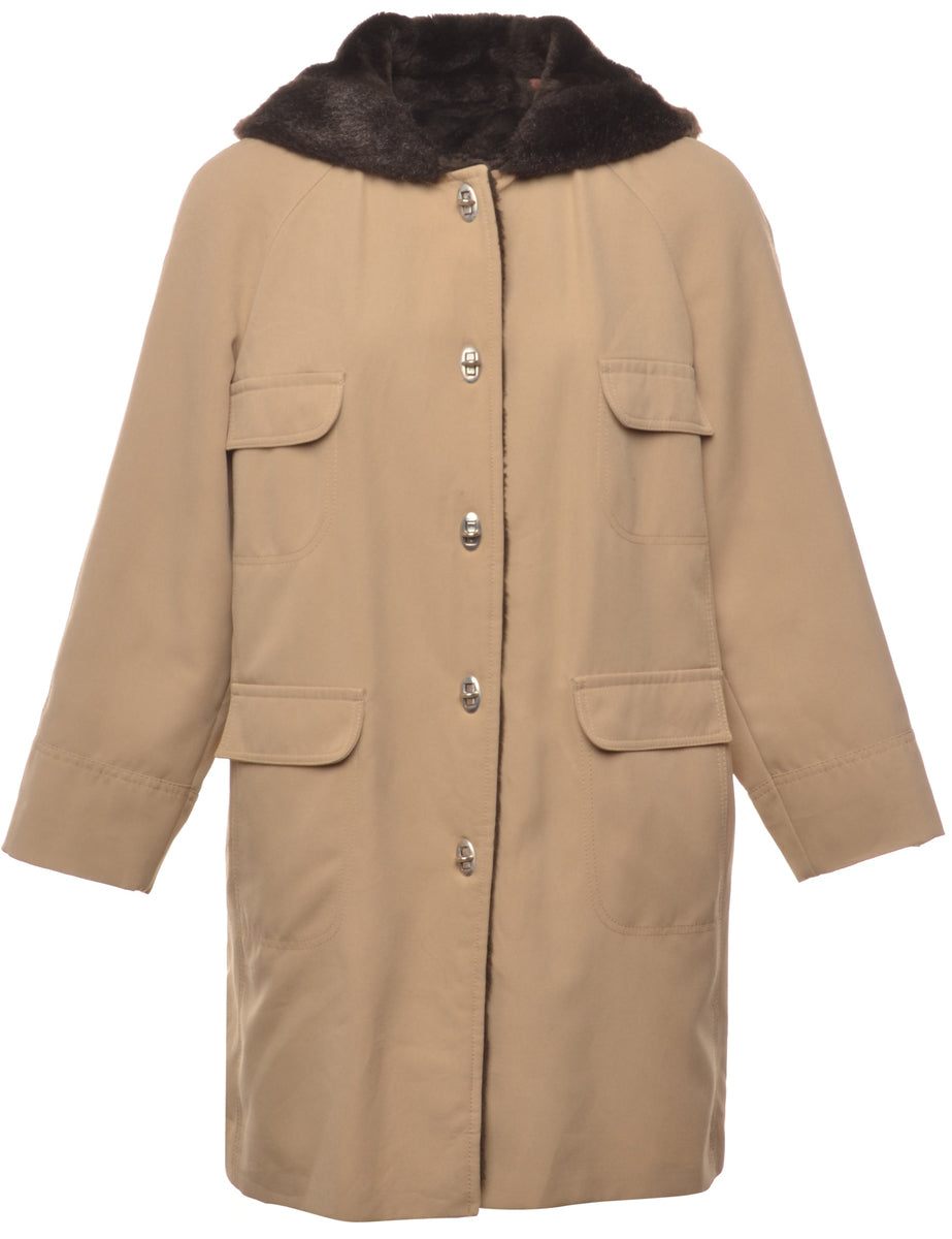 Hooded coat comes in beige & brown with faux fur lining and multiple pockets.