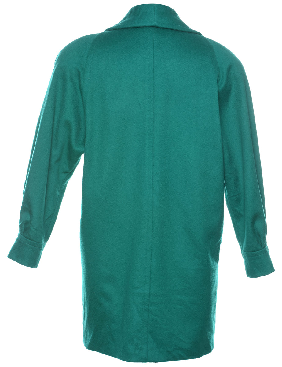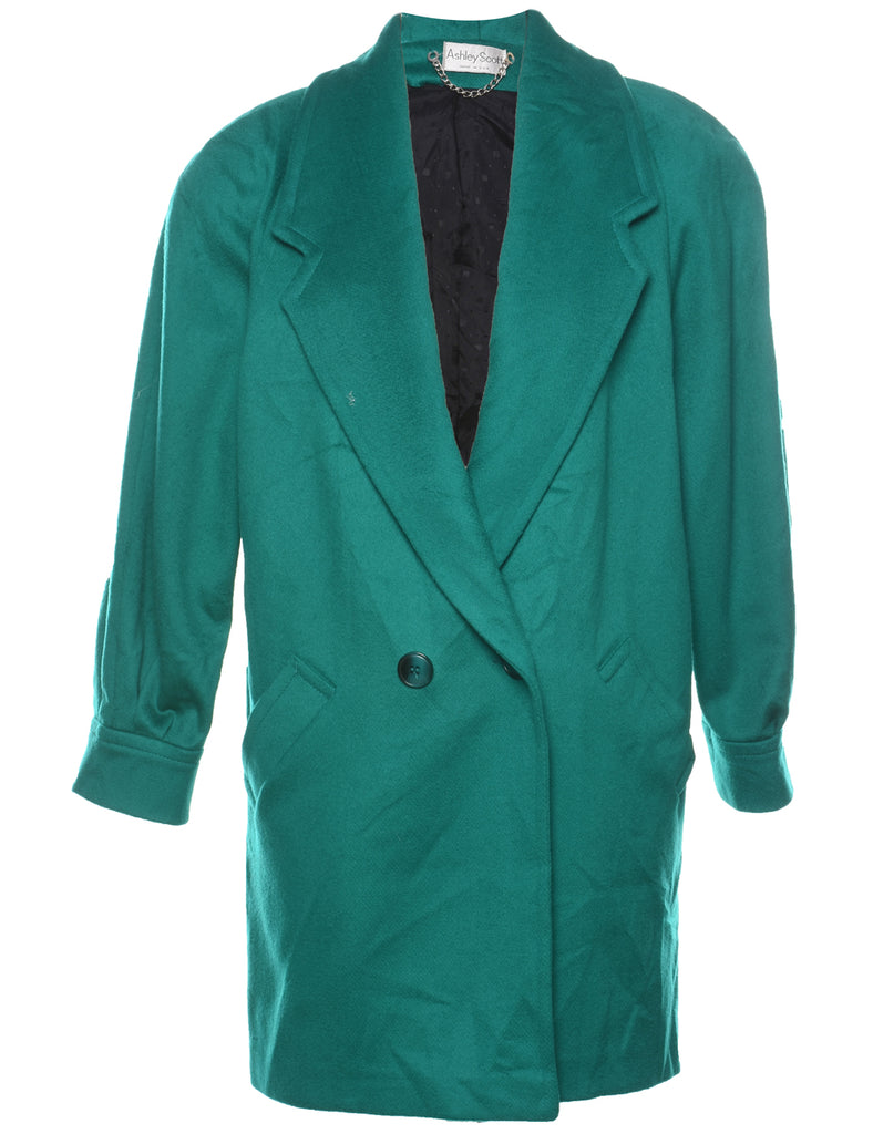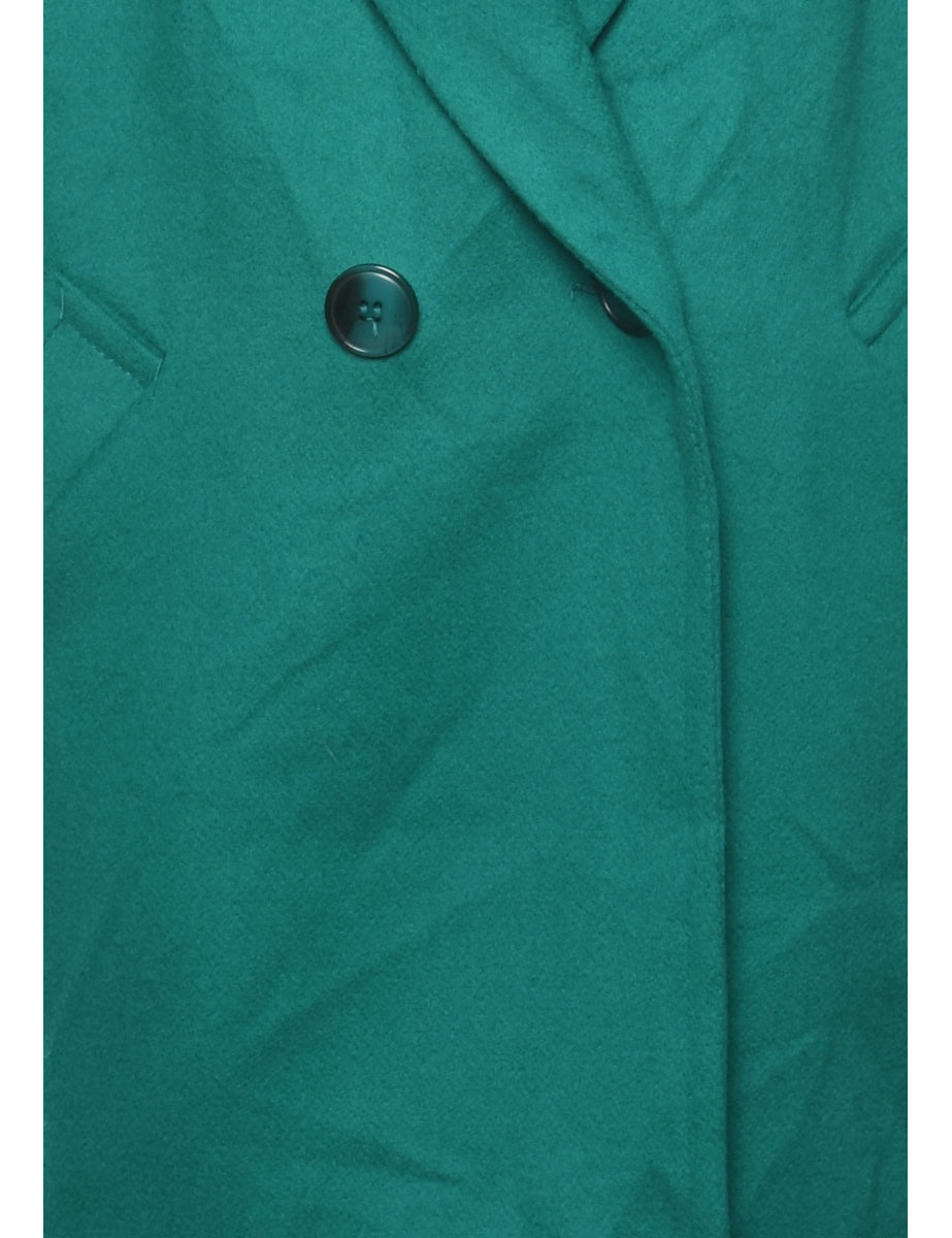 Double breasted wool coat. Comes in green with built in shoulder pads and raglan sleeves.