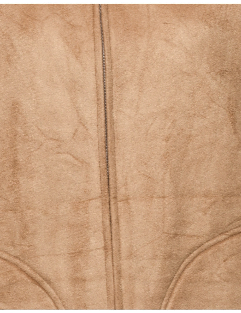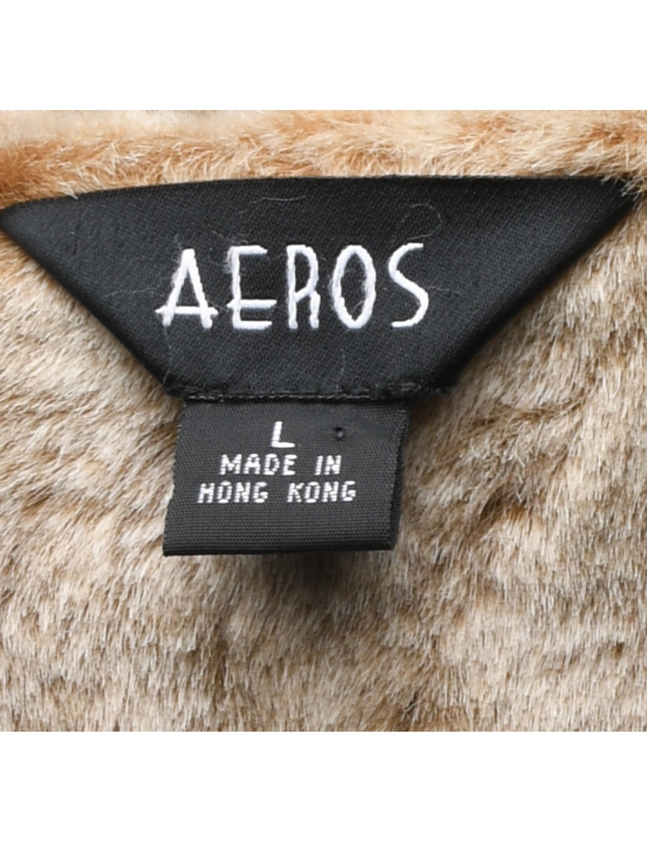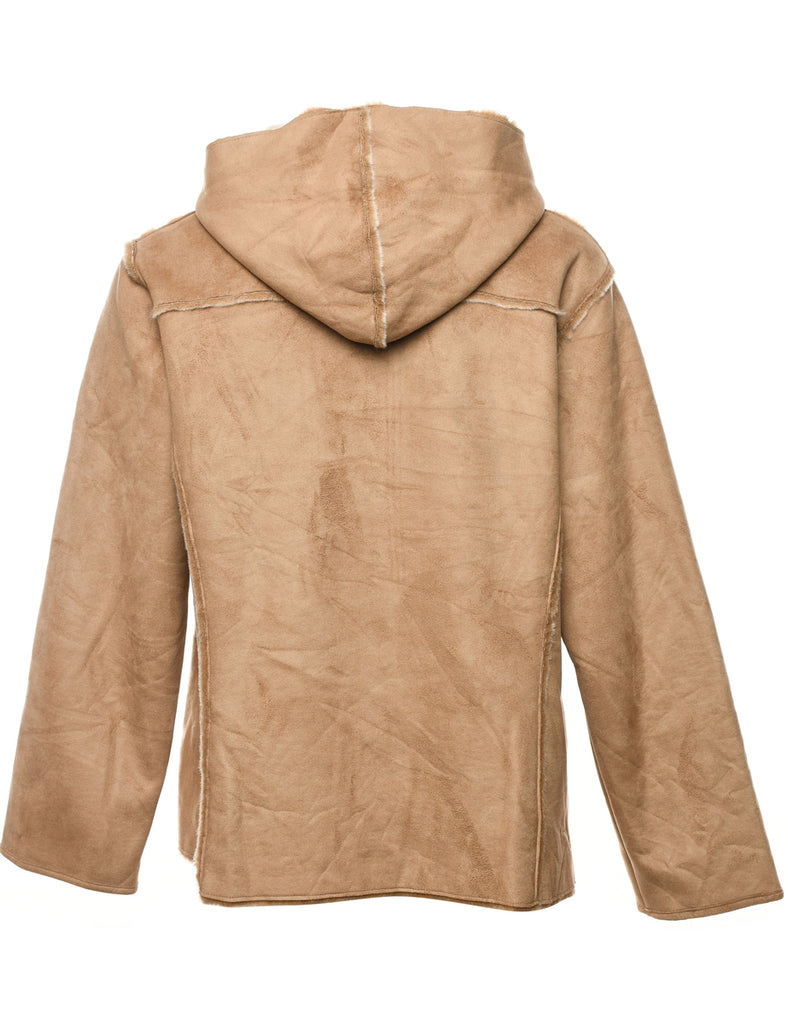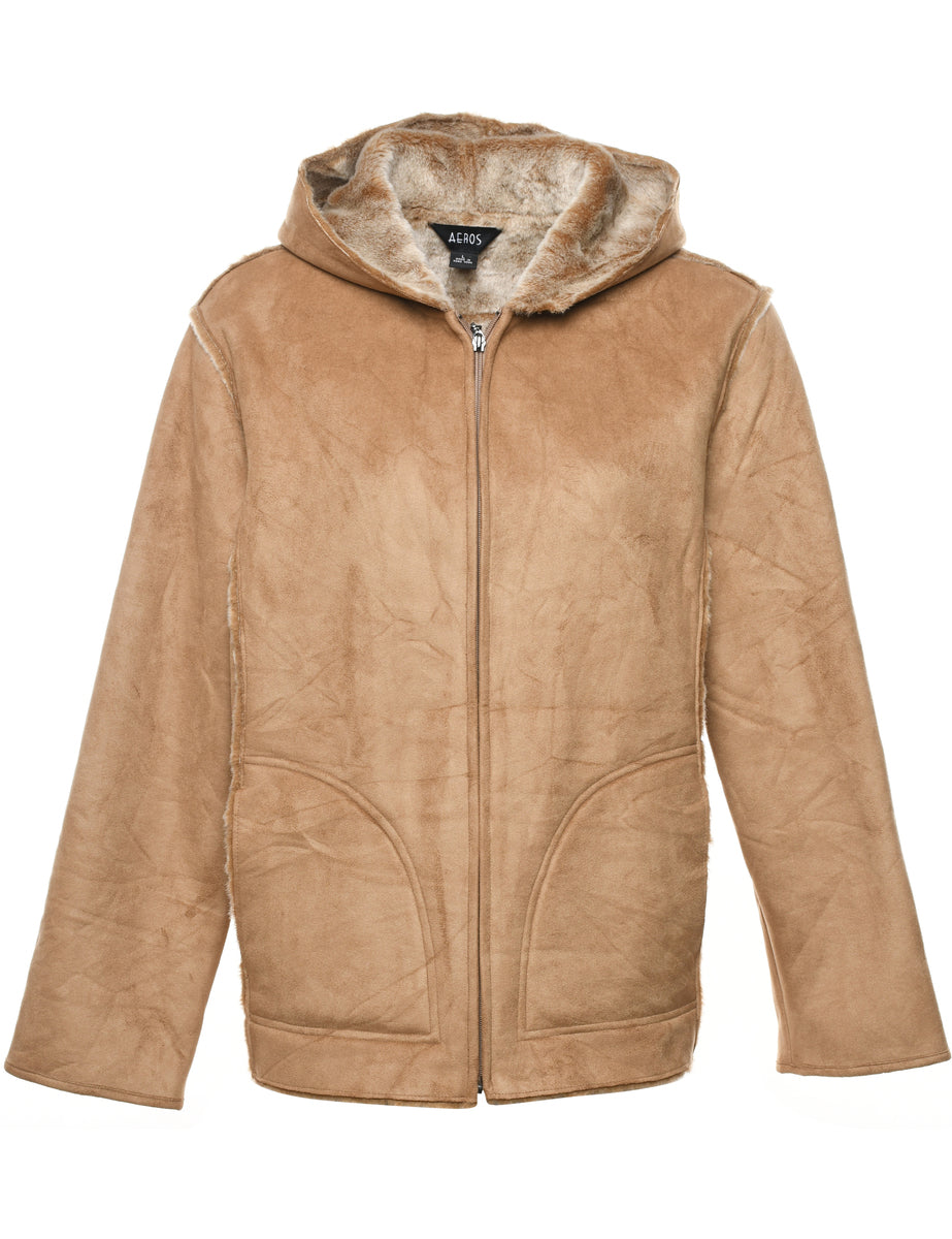 Hooded coat comes in light brown with faux fur lining and multiple pockets.