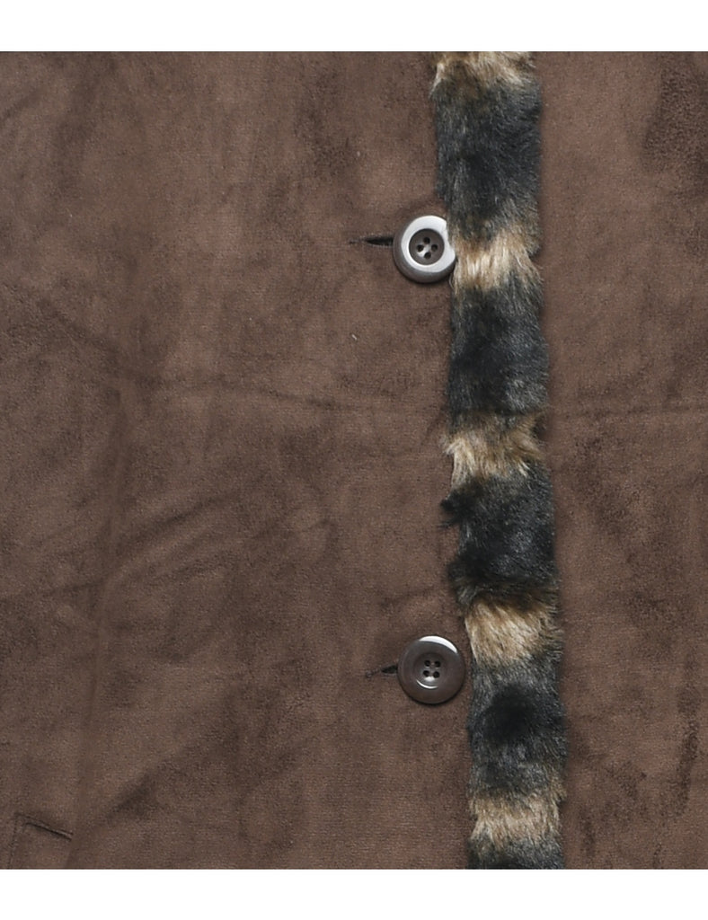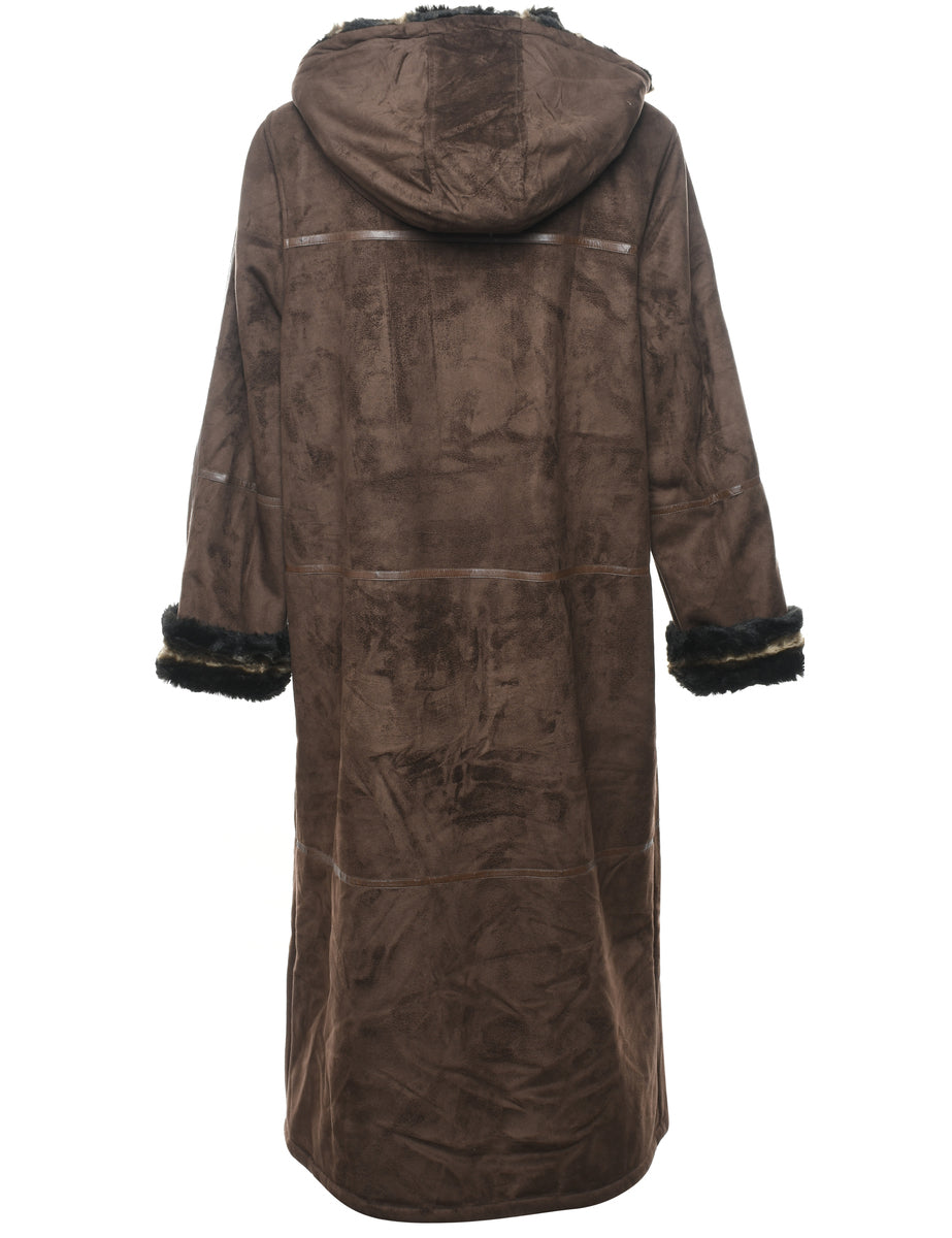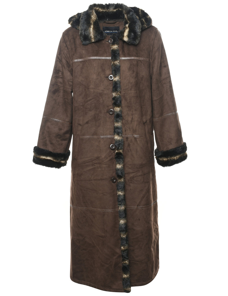 London Fog hooded coat comes in dark brown with faux fur lining and multiple pockets.