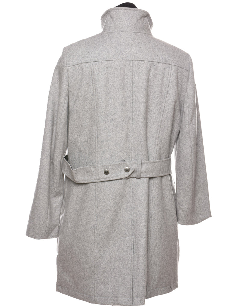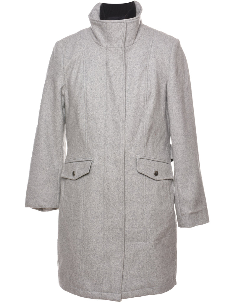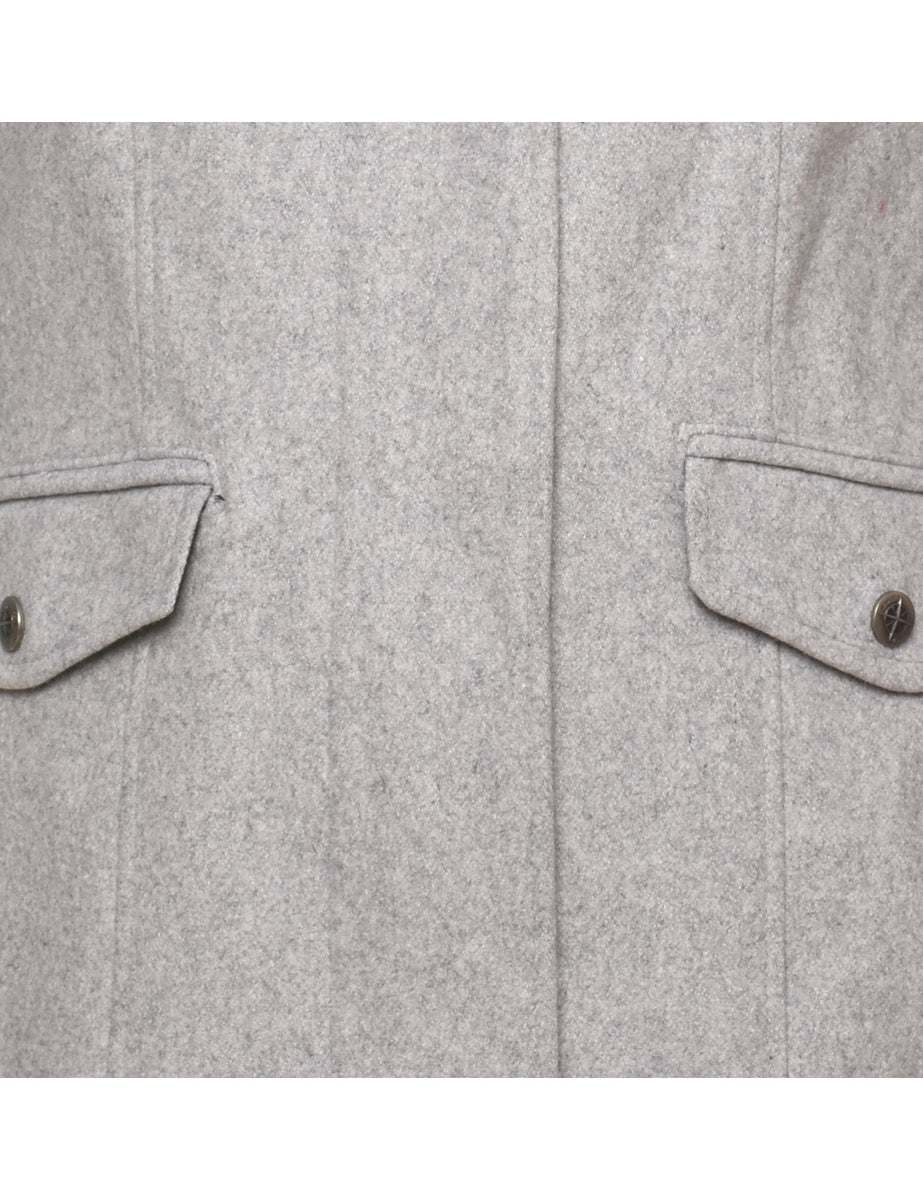Single breasted wool coat. Comes in light grey with full lining and multiple pockets.