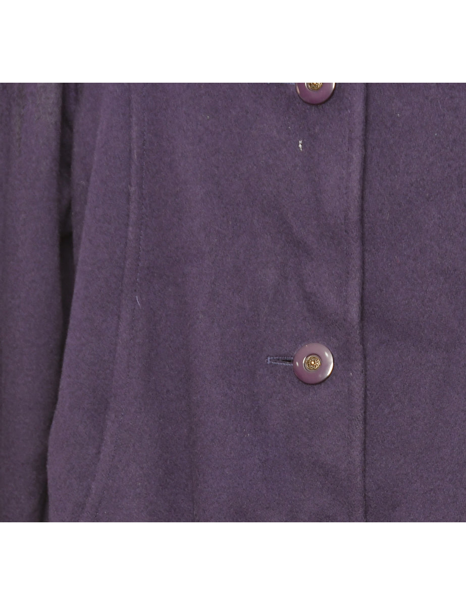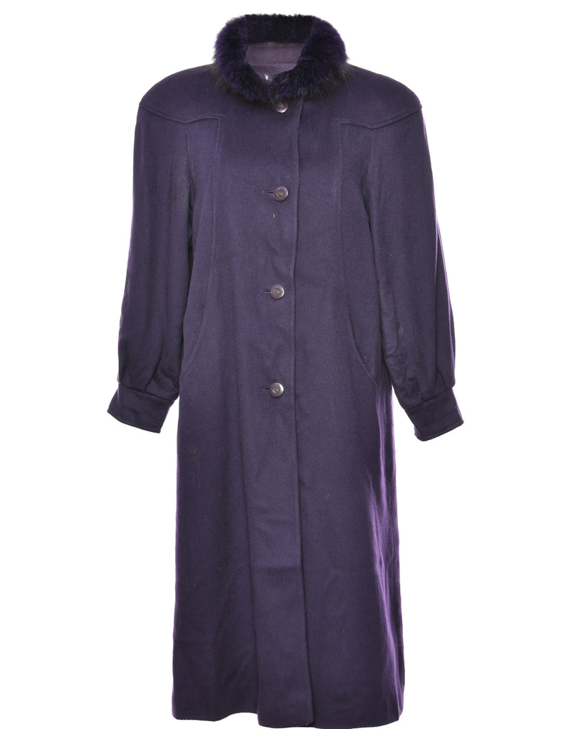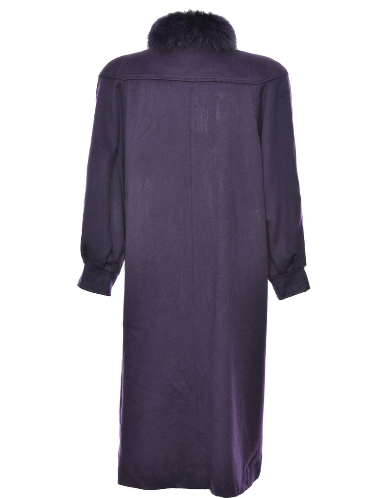 Single-breasted purple fur collar wool coat with multiple pockets.
